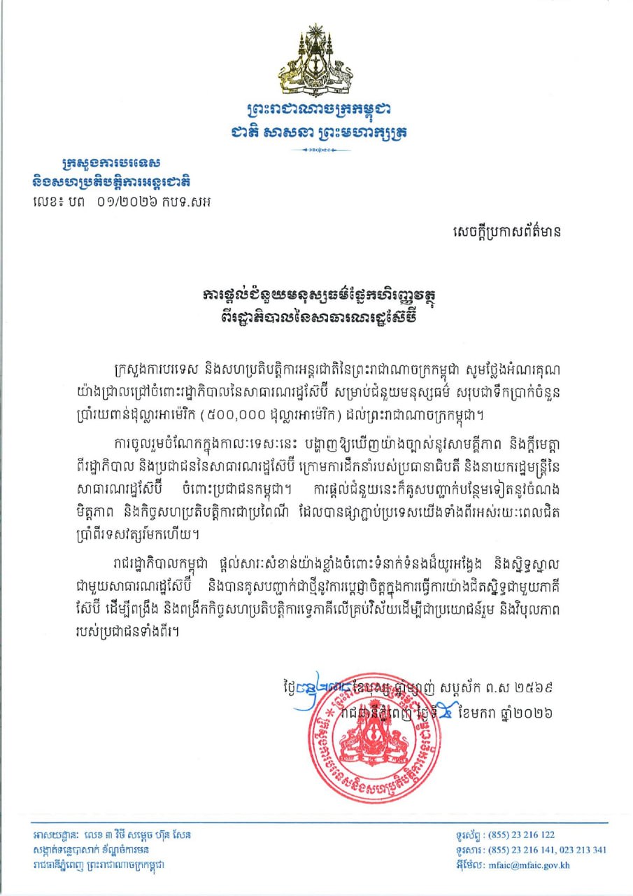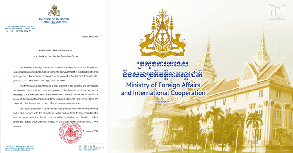 (Phnom Penh): The Ministry of Foreign Affairs and International Cooperation of the Kingdom of Cambodia expresses its profound appreciation to the Government of the Republic of Serbia for its generous humanitarian assistance in the amount of USD 500,000 extended to the Kingdom of Cambodia.