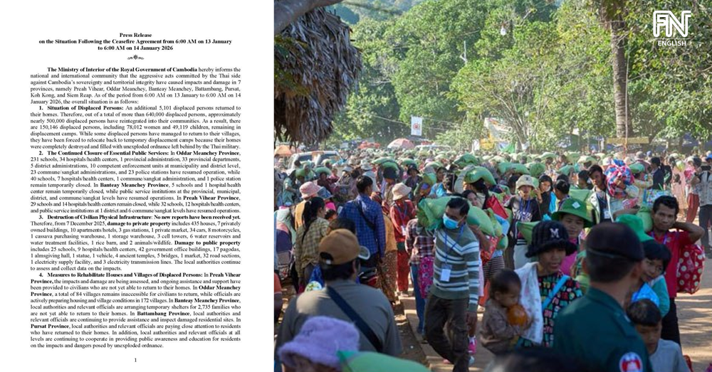 (Phnom Penh): Cambodian Ministry of Interior released an update on Wednesday (Jan. 14) regarding the situation following the ceasefire agreement.