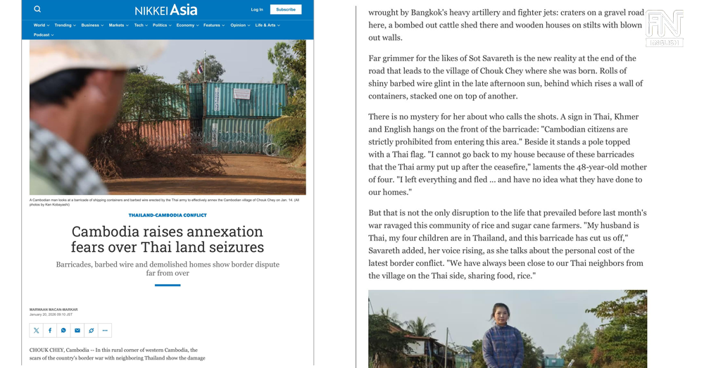 (Phnom Penh): Nikkei Asia published a report on Tuesday (Jan. 20) detailing the severe hardships faced by Cambodian civilians who remain unable to return to their homes, despite the existence of a ceasefire agreement between Cambodia and Thailand.