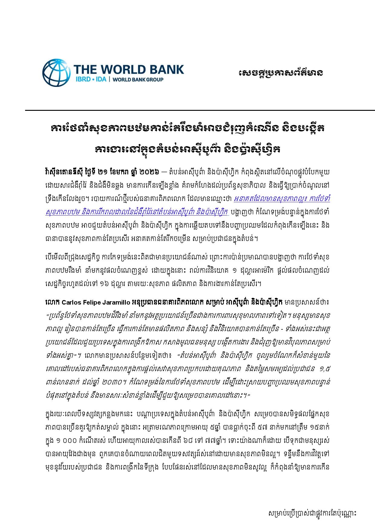“Strong primary health care systems do more than safeguard well-being. Healthier people learn more, work more productively, and save and invest more—benefits that help countries expand opportunity, build human capital, create jobs, and drive inclusive prosperity,” said Carlos Felipe Jaramillo, Vice President for EAP at the World Bank.