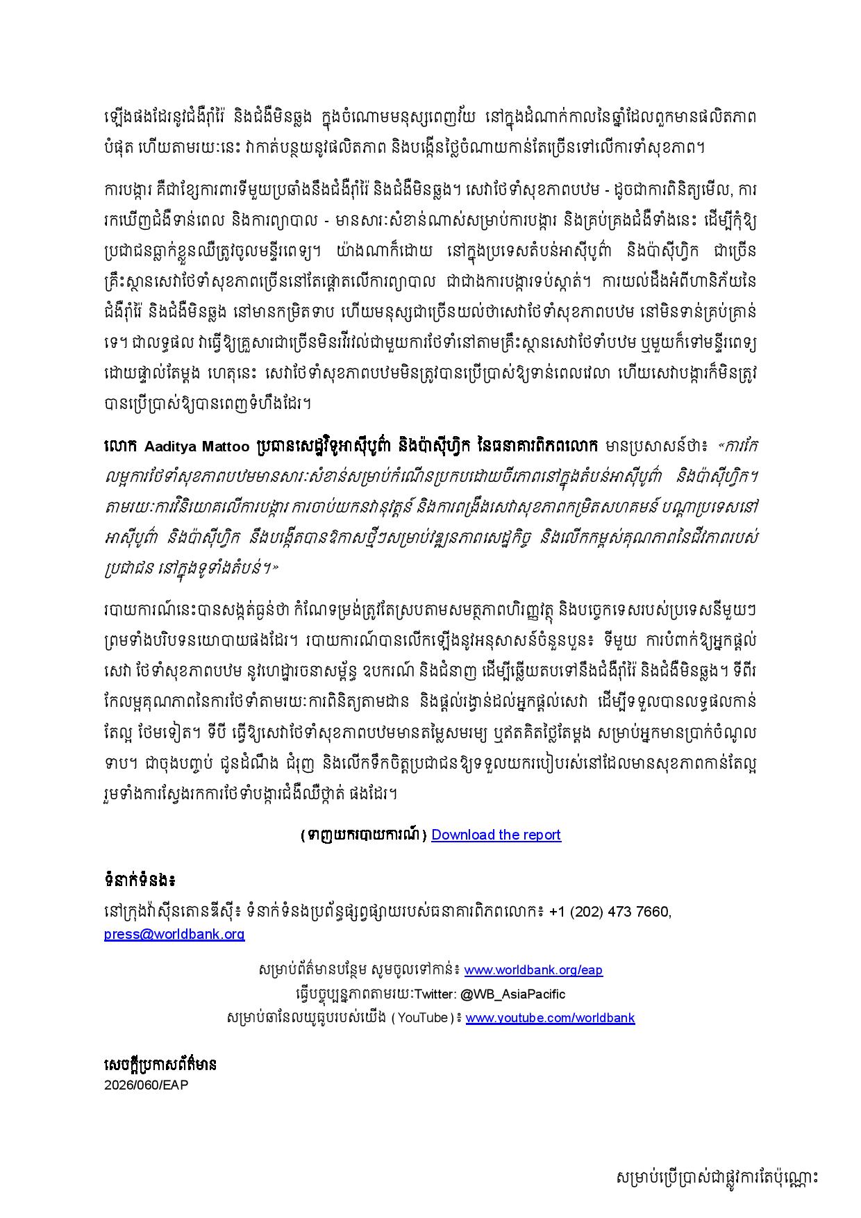“Improved primary health care is critical for sustained growth in East Asia and the Pacific,” said Aaditya Mattoo, EAP Chief Economist at the World Bank. “By investing in prevention, embracing innovation, and strengthening community-level health services, EAP countries create new opportunities for economic progress and improve the quality of life across the region.”