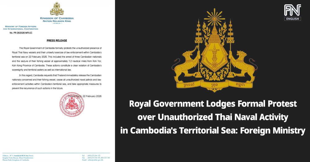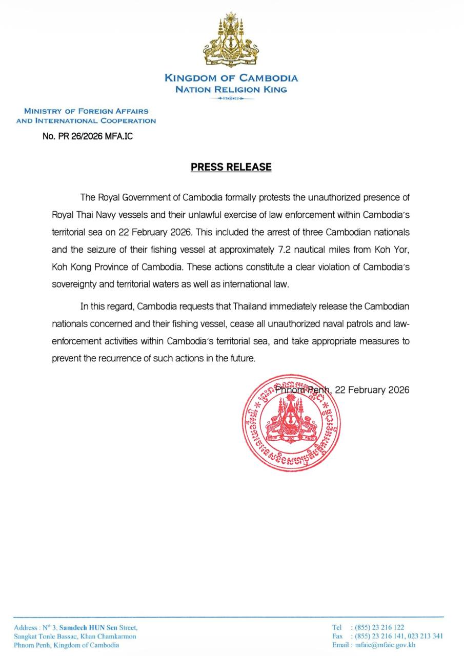 (Phnom Penh): The Royal Government of Cambodia formally protested the unauthorized presence of Royal Thai Navy vessels and their unlawful exercise of law enforcement within Cambodia's territorial sea on 22 February 2026, according to a press release issued by Cambodian Foreign Ministry on Sunday night (Feb. 22).