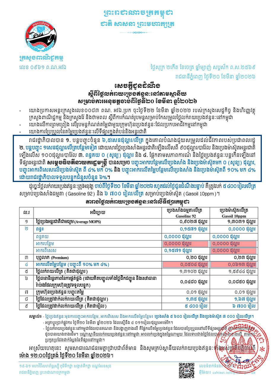 According to a press release issued by the Ministry of Commerce on 20 March 2026, the Royal Government of Cambodia, under the leadership of Prime Minister Hun Manet, has implemented the following measures to ease the burden on citizens: