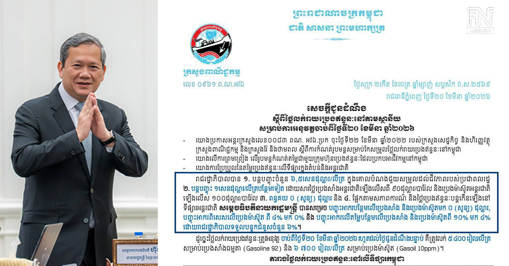 (Phnom Penh): The Royal Government of Cambodia has introduced a series of measures to mitigate the impact of rising global fuel prices, in coordination with the Ministries of Economy and Finance, Commerce, and Mines and Energy.