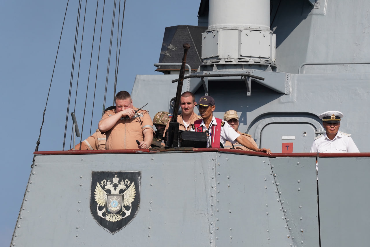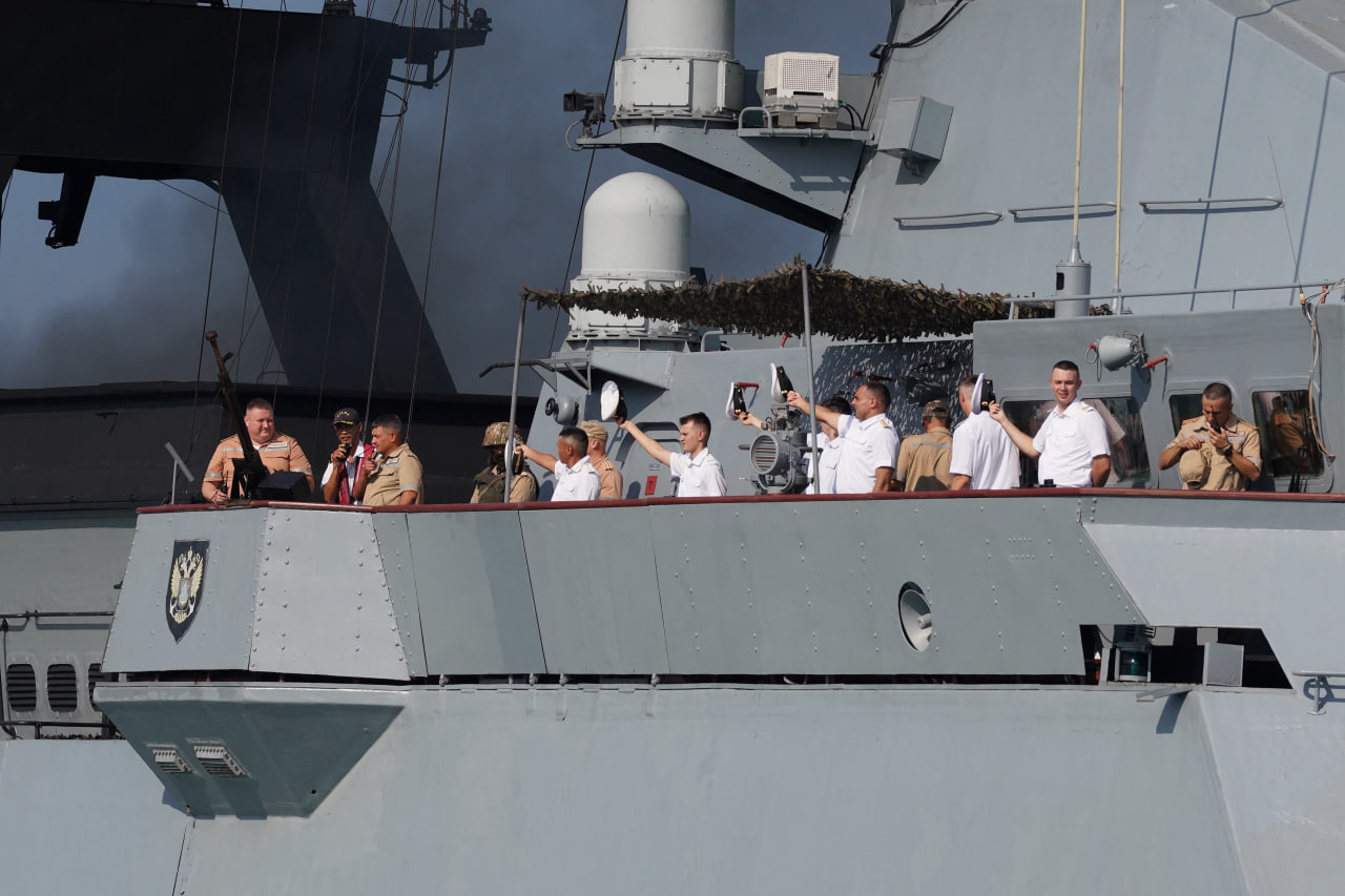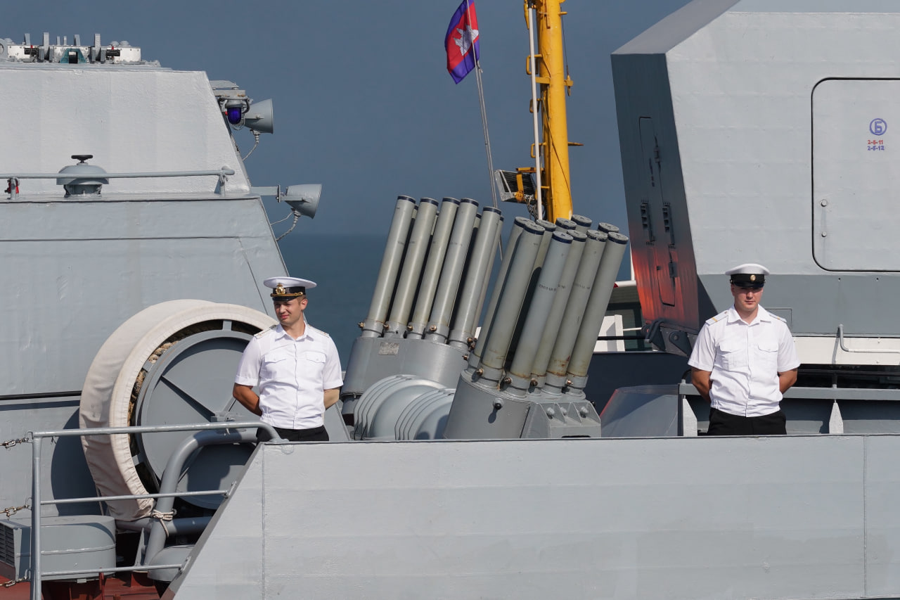 The warships docked at around 9:00 a.m., where they were warmly welcomed by Rear Admiral In Sokhemara, Deputy Commander of Ream Naval Base of the Royal Cambodian Navy, along with 60 Cambodian naval personnel. Russian Ambassador to Cambodia Anatoly Borovik also attended the port call.