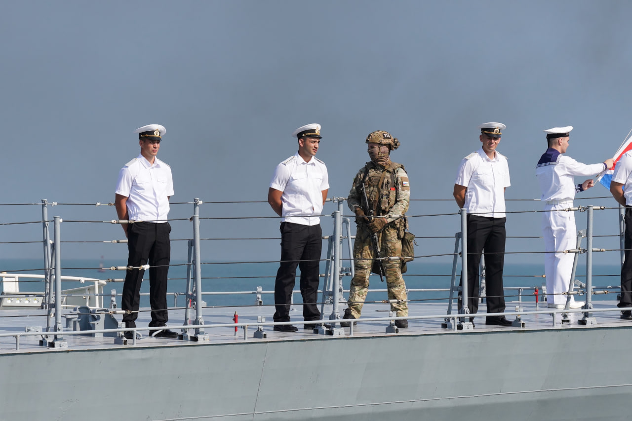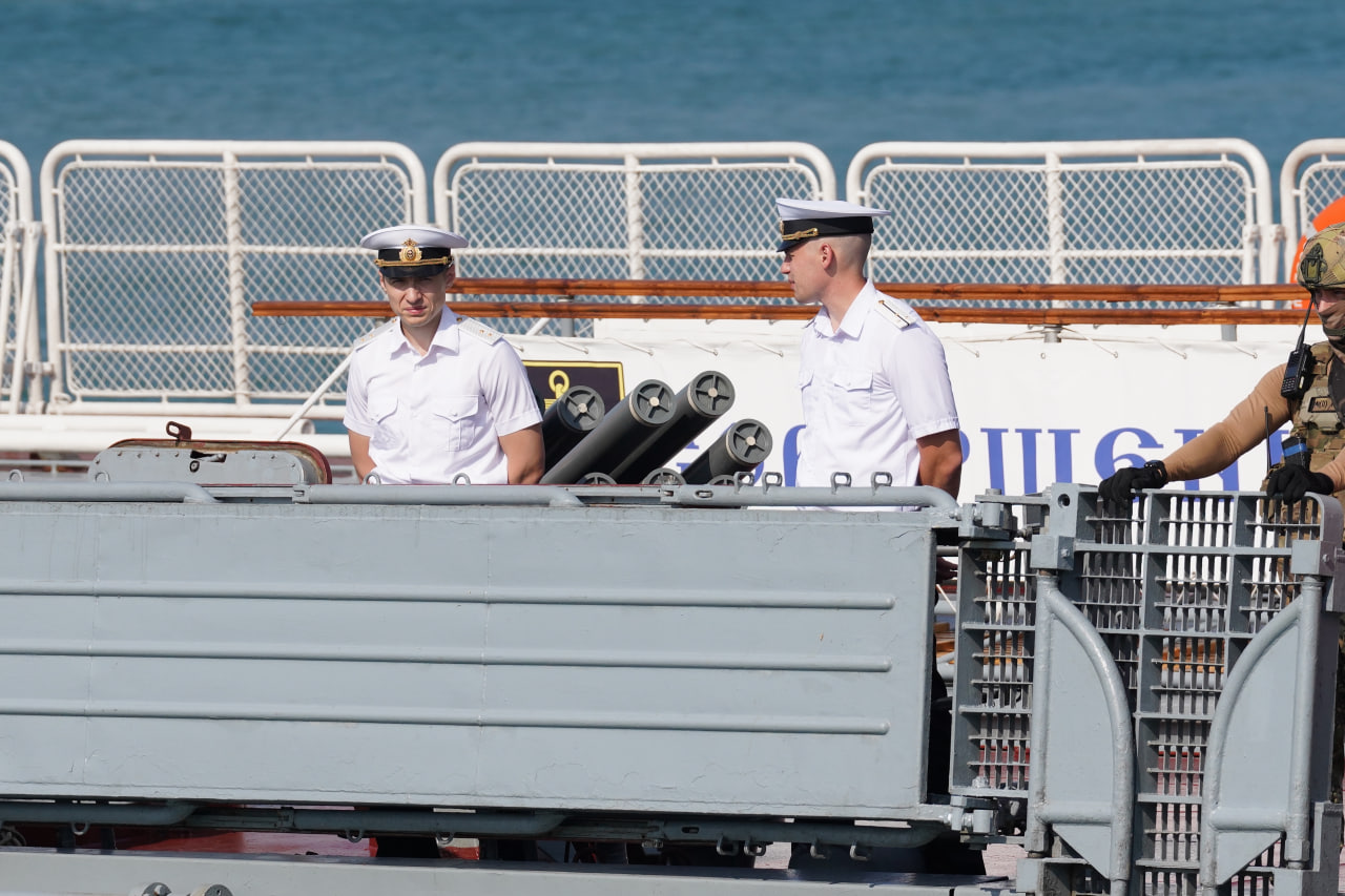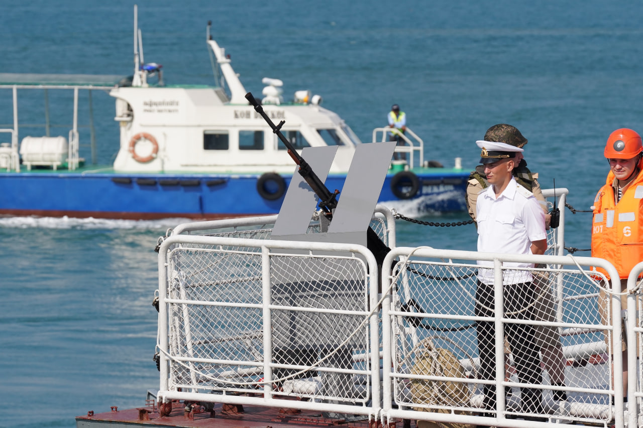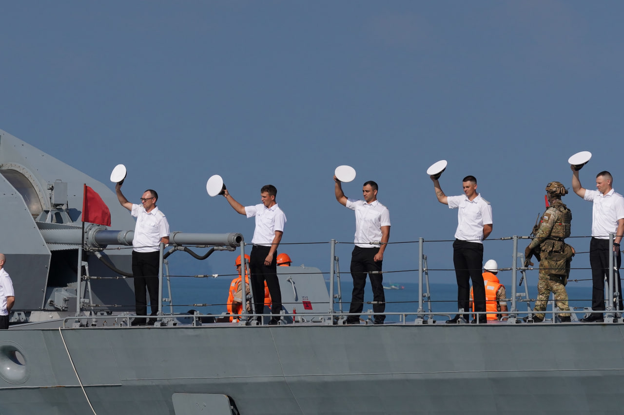 The warships docked at around 9:00 a.m., where they were warmly welcomed by Rear Admiral In Sokhemara, Deputy Commander of Ream Naval Base of the Royal Cambodian Navy, along with 60 Cambodian naval personnel. Russian Ambassador to Cambodia Anatoly Borovik also attended the port call.