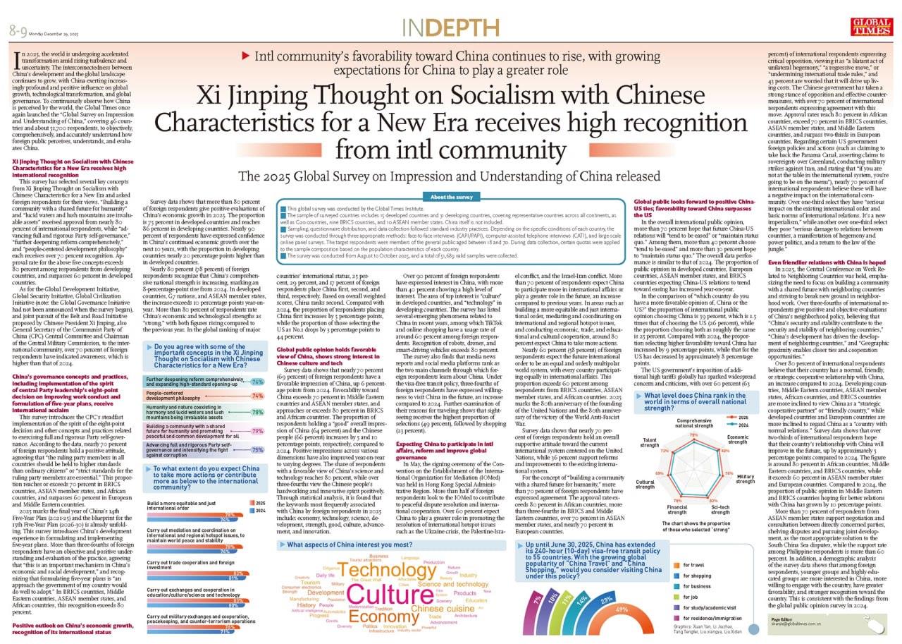 BEIJING, Dec. 29 (Global Times): In 2025, the world is undergoing accelerated transformation amid rising turbulence and uncertainty. The interconnectedness between China's development and the global landscape continues to grow, with China exerting increasingly profound and positive influence on global growth, technological transformation, and global governance. To continuously observe how China is perceived by the world, the Global Times once again launched the "Global Survey on Impression and Understanding of China," covering 46 countries and about 51,700 respondents, to objectively, comprehensively, and accurately understand how foreign public perceives, understands, and evaluates China.