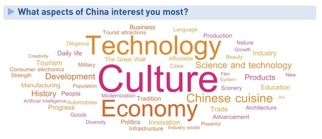 The share of respondents with a favorable view of China's science and technology reaches 80 percent, while over three-fourths view the Chinese people's hardworking and innovative spirit positively. Through statistical analysis, it is found that the keywords most frequently associated with China by foreign respondents in 2025 include: economy, technology, science, development, strength, good, culture, advancement, and innovation.