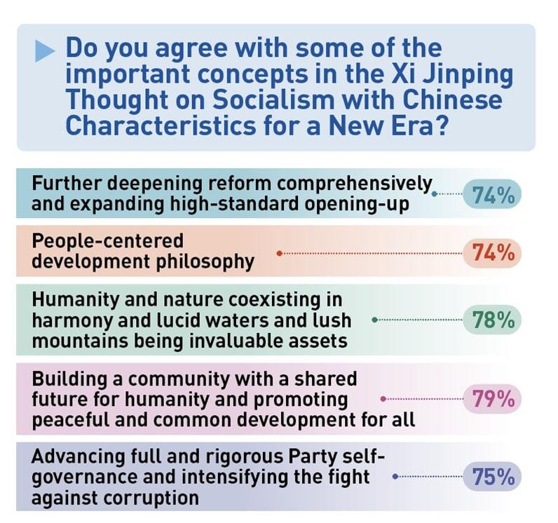 This survey has selected several key concepts from Xi Jinping Thought on Socialism with Chinese Characteristics for a New Era and asked foreign respondents for their views. "Building a community with a shared future for humanity" and "lucid waters and lush mountains are invaluable assets" received approval from nearly 80 percent of international respondents, while "advancing full and rigorous Party self-governance," "further deepening reform comprehensively," and "people-centered development philosophy" each receives over 70 percent recognition. Approval rate for the above five concepts exceeds 80 percent among respondents from developing countries, and surpasses 60 percent in developed countries.
