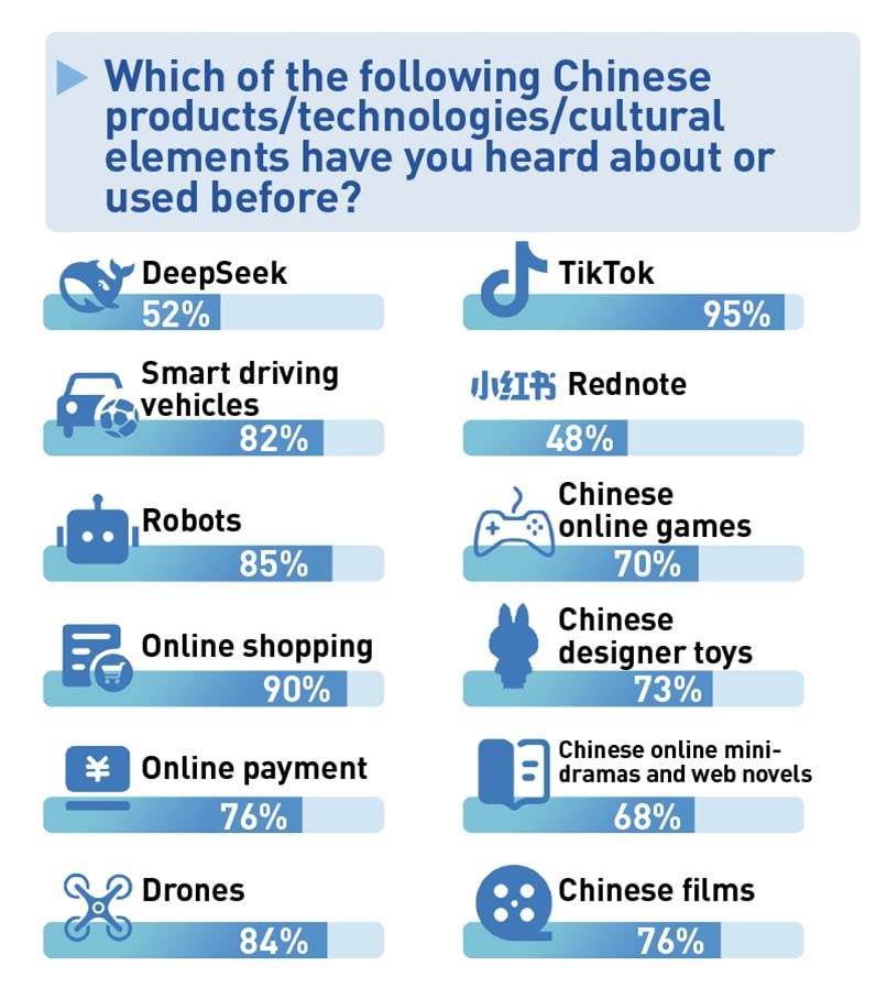Over 90 percent of foreign respondents have expressed interest in China, with more than 40 percent showing a high level of interest. The area of top interest is "culture" in developed countries, and "technology" in developing countries. The survey has listed several emerging phenomena related to China in recent years, among which TikTok and online shopping have a usage rate of around 60 percent among foreign respondents. Recognition of robots, drones, and smart-driving vehicles exceeds 80 percent.