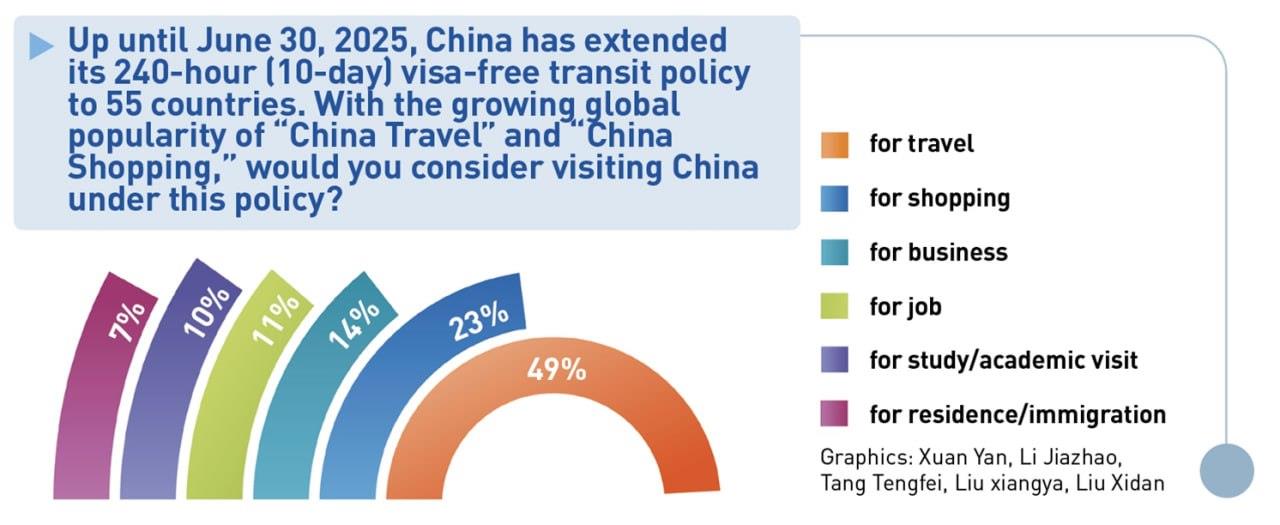 The survey also finds that media news reports and social media platforms rank as the two main channels through which foreign respondents learn about China. Under the visa-free transit policy, three-fourths of foreign respondents have expressed willingness to visit China in the future, an increase compared to 2024. Further examination of their reasons for traveling shows that sightseeing receives the highest proportion of selections (49 percent), followed by shopping (23 percent).