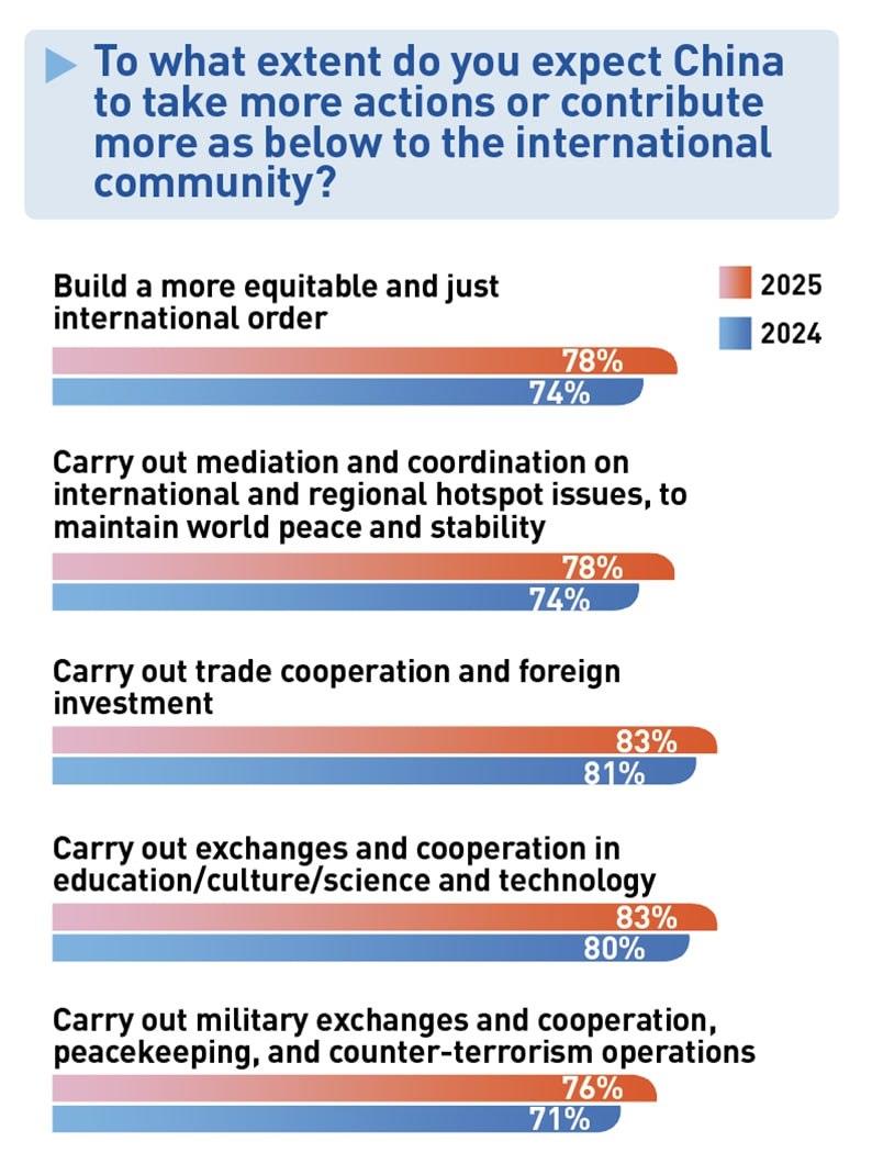 Over 60 percent expect China to play a greater role in promoting the resolution of international hotspot issues such as the Ukraine crisis, the Palestine-Israel conflict, and the Israel-Iran conflict. More than 70 percent of respondents expect China to participate more in international affairs or play a greater role in the future, an increase compared to previous years. In areas such as building a more equitable and just international order, mediating and coordinating on international and regional hotspot issues, and conducting economic, trade, and educational and cultural cooperation, around 80 percent expect China to take more actions.