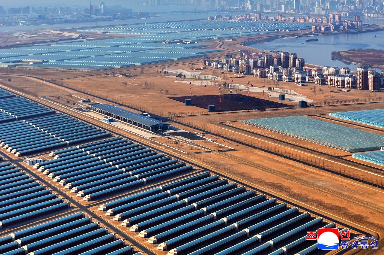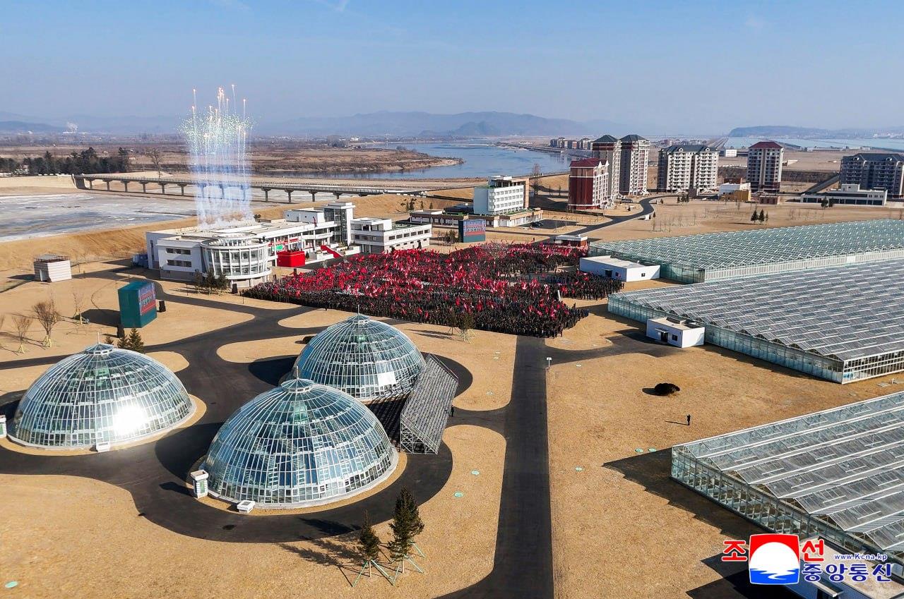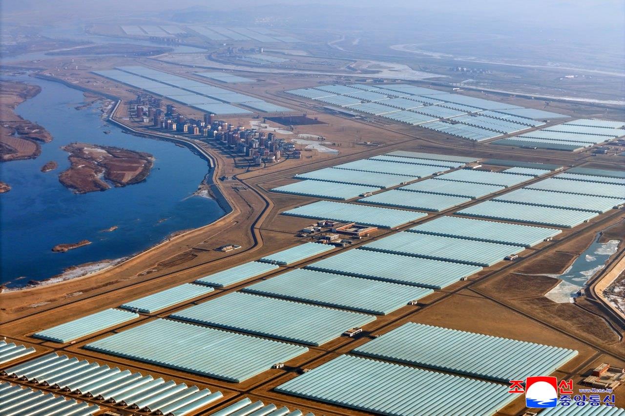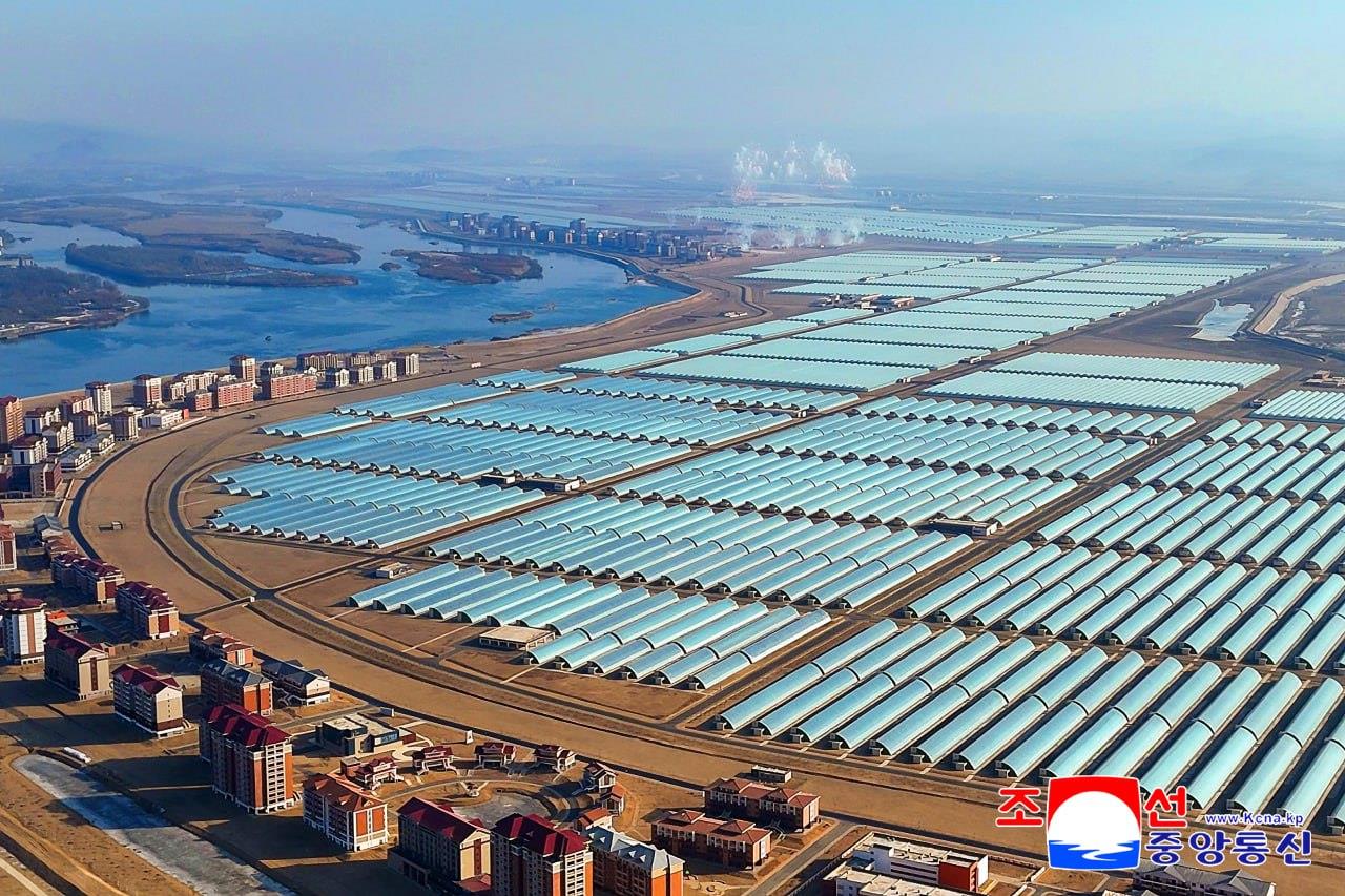 At the time when the absolute trust in and devoted loyalty to the WPK, organizer and guide of all victories of the Korean people, are permeating the whole country advancing towards the glorious Party Congress, an ideal farm town with an unprecedented group of large greenhouses has been erected on the bank of River Amnok in the northwestern part of the country to greet the great auspicious event of inauguration.