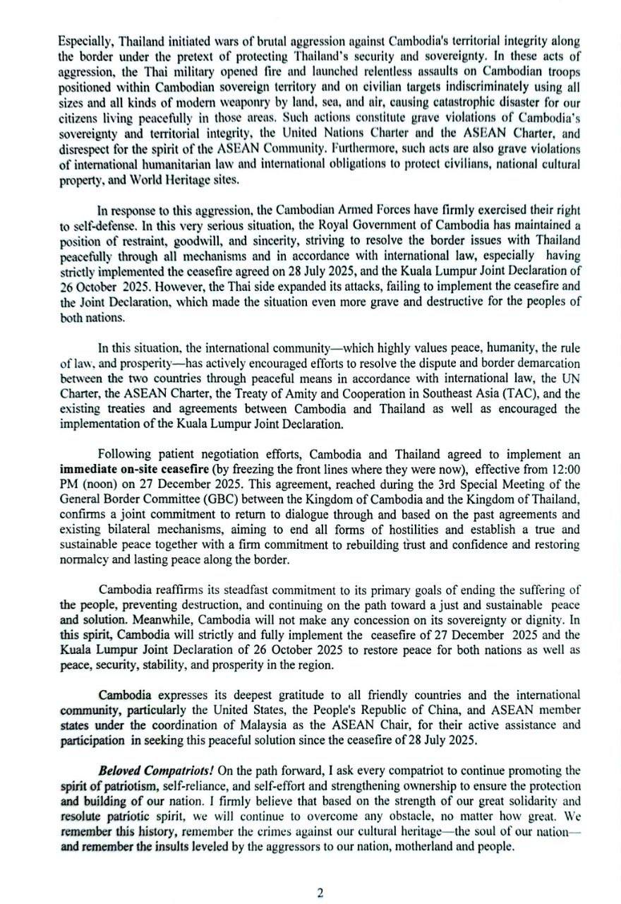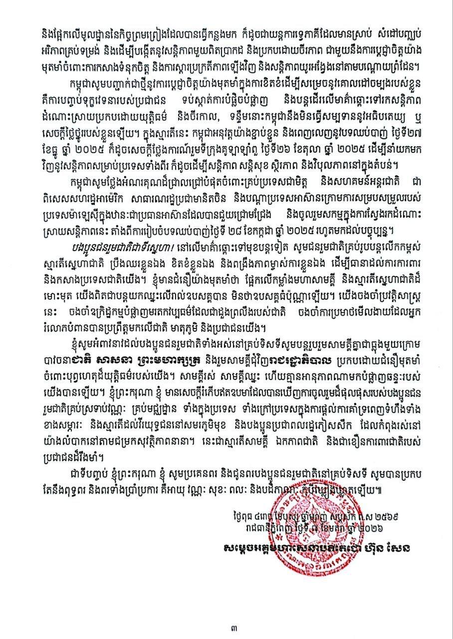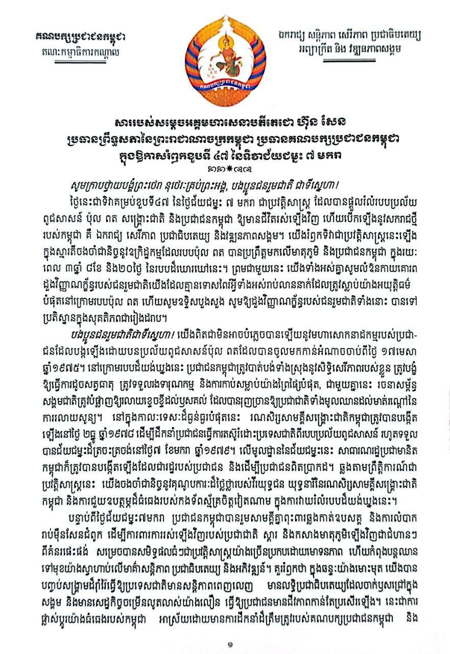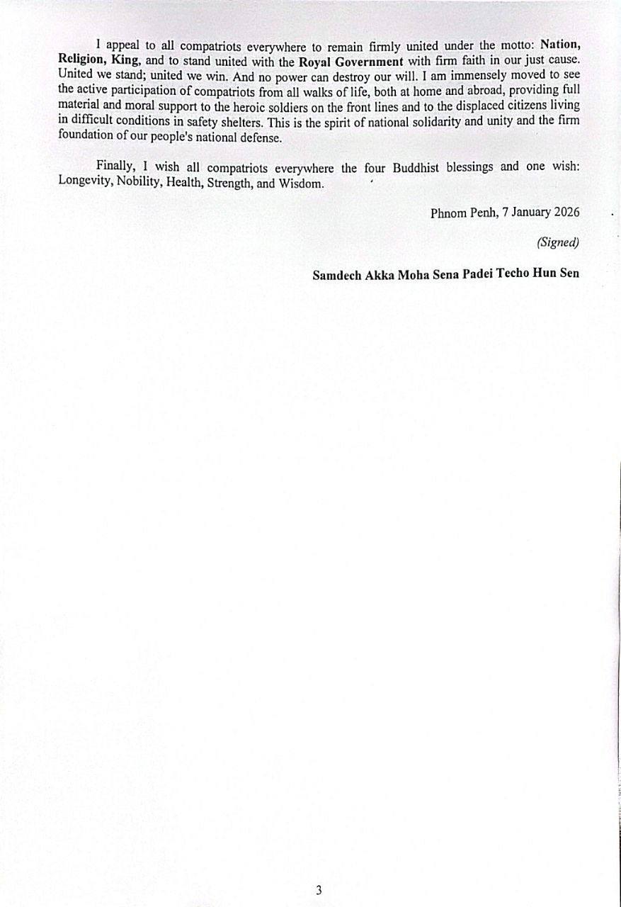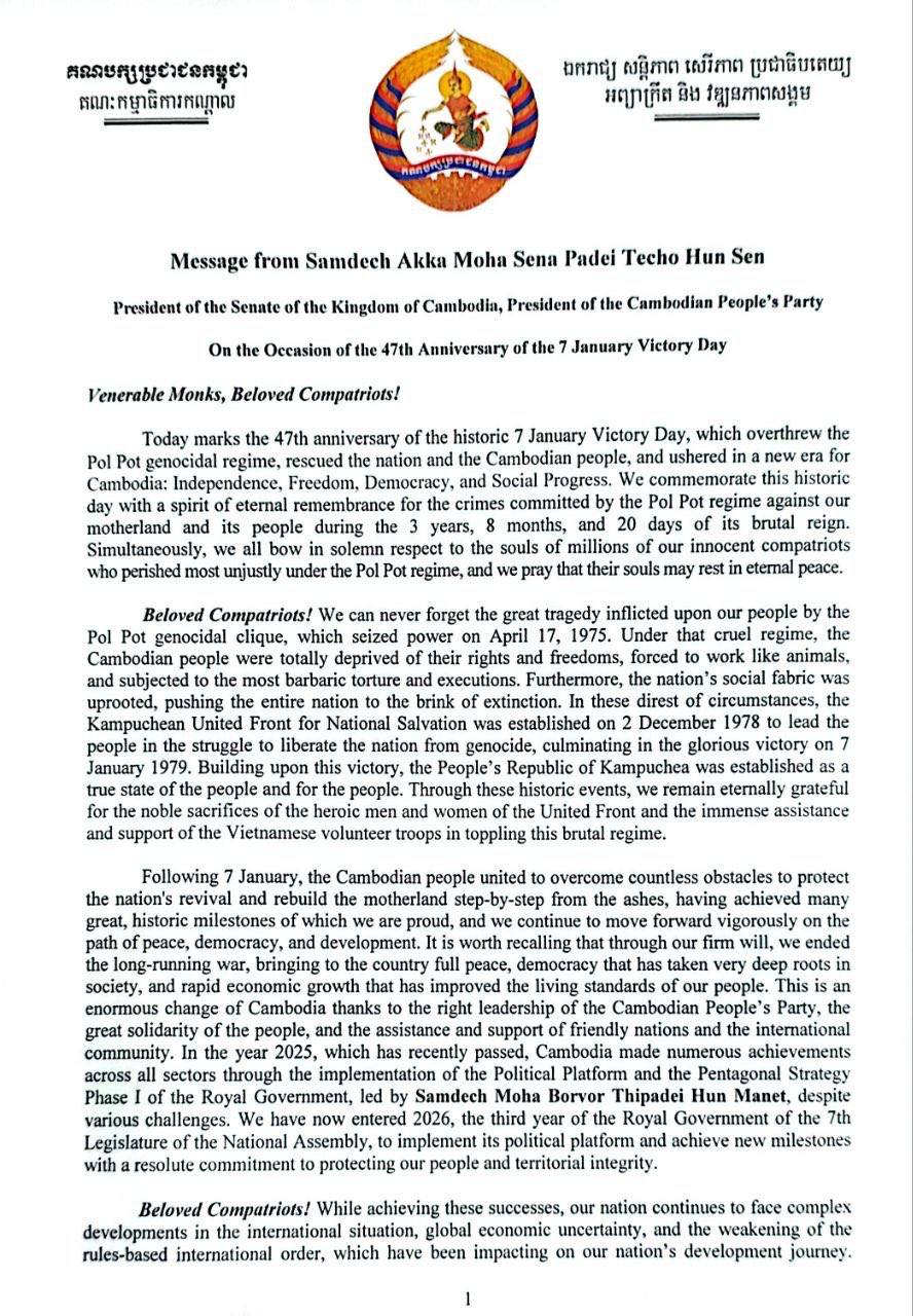 (Phnom Penh): On 7 January 2026, as Cambodia marks the 47th Anniversary of Victory Day, Samdech Techo Hun Sen, President of the Senate and President of the Cambodian People’s Party, released a special message to the Cambodian people. The message reads: