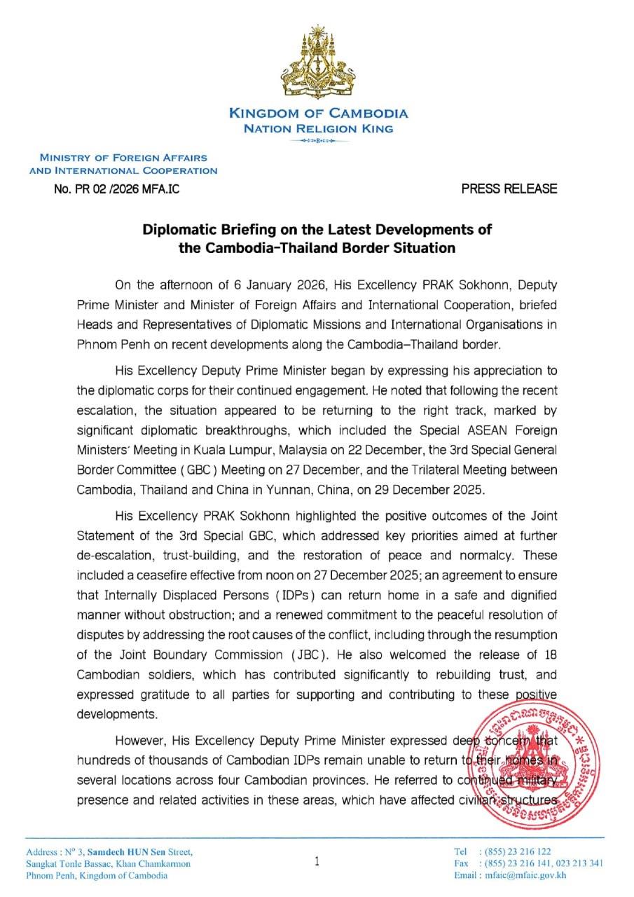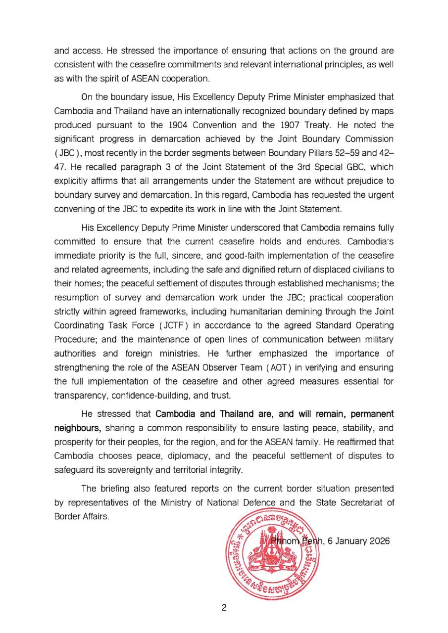 His remarks were made on the afternoon of 6 January 2026 during his diplomatic briefing on recent developments along the Cambodia–Thailand border with Heads and Representatives of Diplomatic Missions and International Organisations in Phnom Penh.