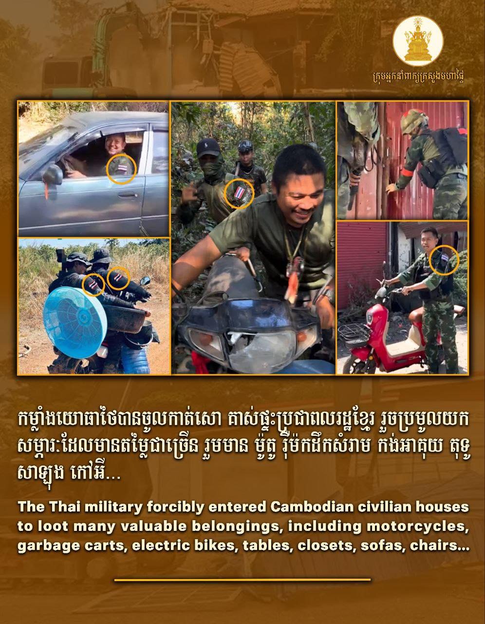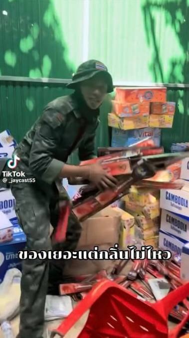 The images and videos circulating online appear to show Thai soldiers in uniform entering civilian spaces—homes and village areas—and behaving as if they are pleased to collect and take civilian belongings. Such conduct is widely perceived by Cambodian viewers as resembling criminal looting, not the behavior of disciplined soldiers.