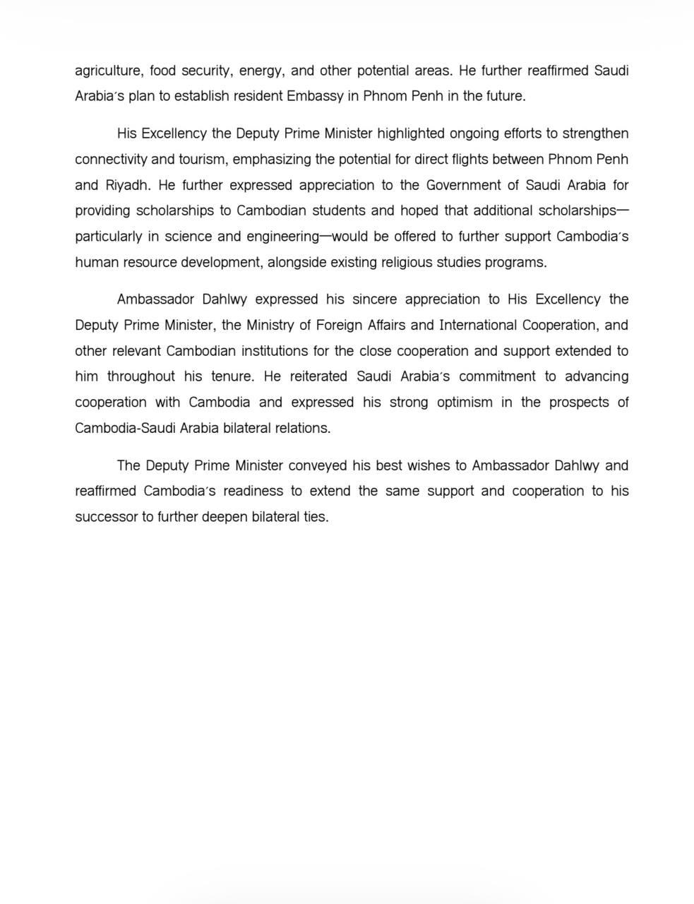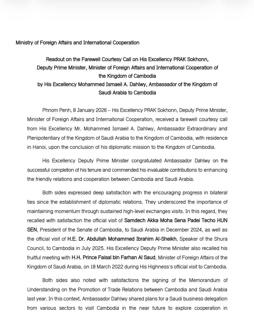 (Phnom Penh): On 8 January 2026, Cambodian Foreign Minister Prak Sokhonn received a farewell courtesy call from Mohammed Ismaeil A. Dahlwy, Ambassador Extraordinary and Plenipotentiary of the Kingdom of Saudi Arabia to the Kingdom of Cambodia, with residence in Hanoi, upon the conclusion of his diplomatic mission to the Kingdom of Cambodia.