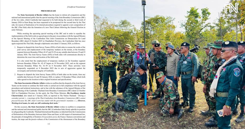 (Phnom Penh): The State Secretariat of Border Affairs announced that the special meeting of the Joint Boundary Commission (JBC) of the two sides, which Cambodia had requested to be held during the second or third week of January 2026 in Siem Reap, has been requested to be postponed for the second time by the Thai side, for reason of finalization of its internal procedures required to appoint a new composition of the JBC (Thai Side) after the formation of a new Thai Cabinet following the General Election in early February, according to the press release seen by Fresh News on Wednesday (Jan. 14).