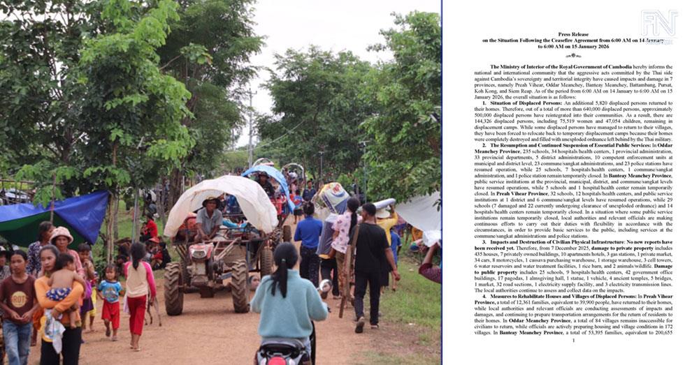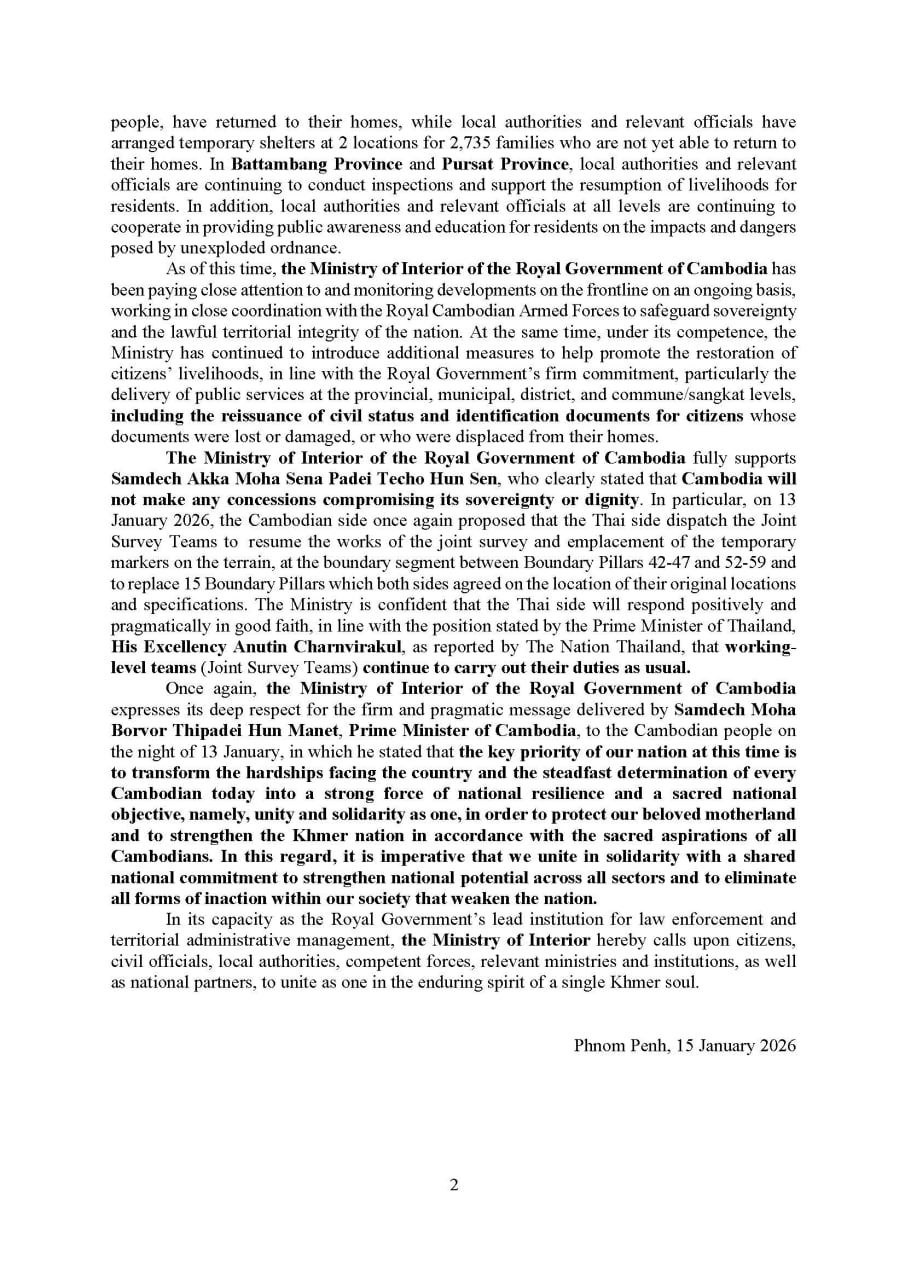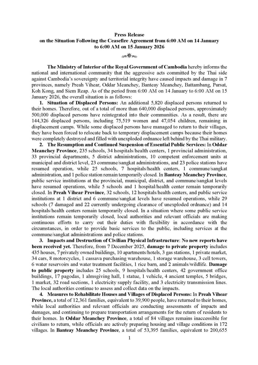 (Phnom Penh): Cambodian Ministry of Interior released an update on Thursday (Jan. 15) regarding the situation following the ceasefire agreement.