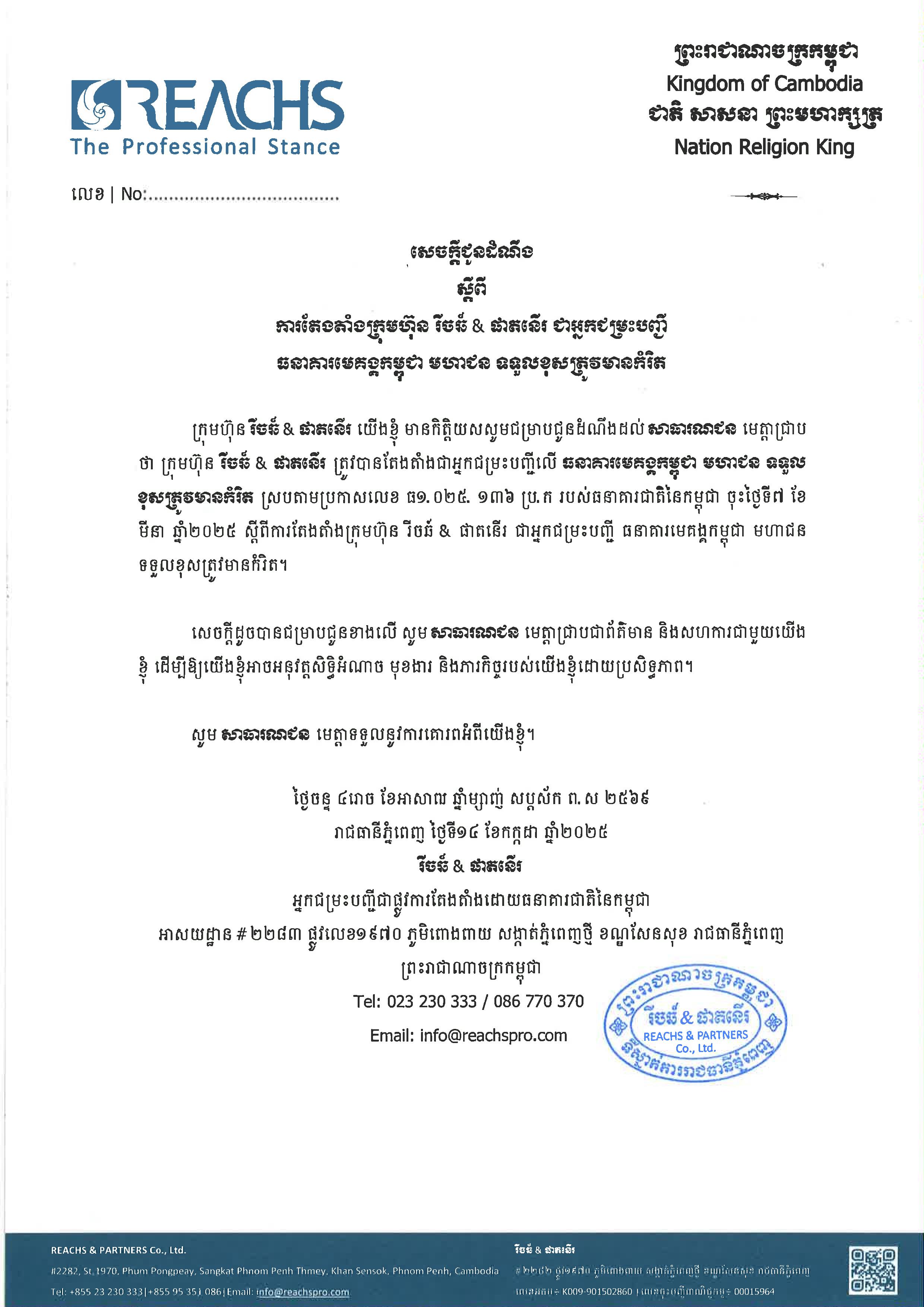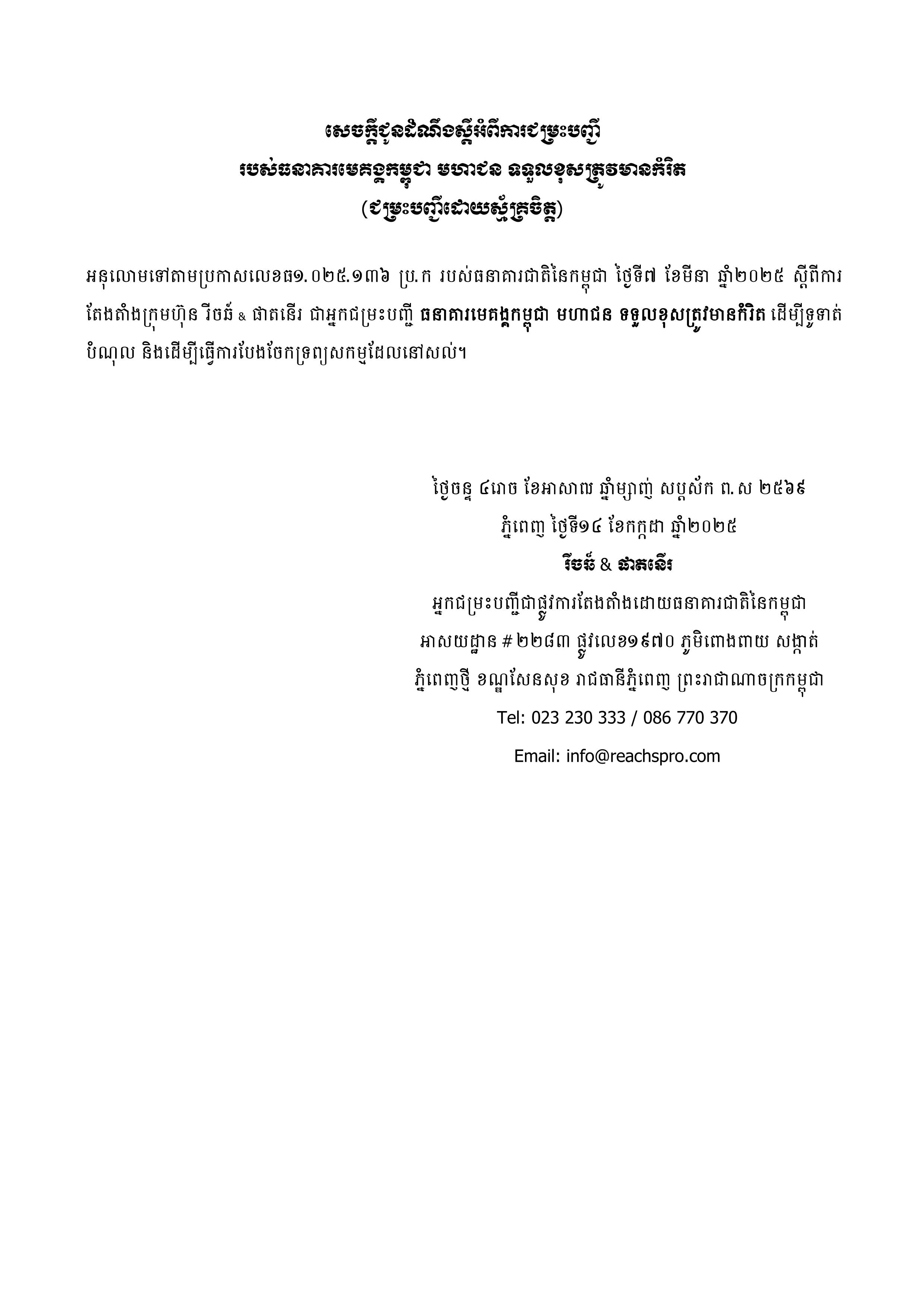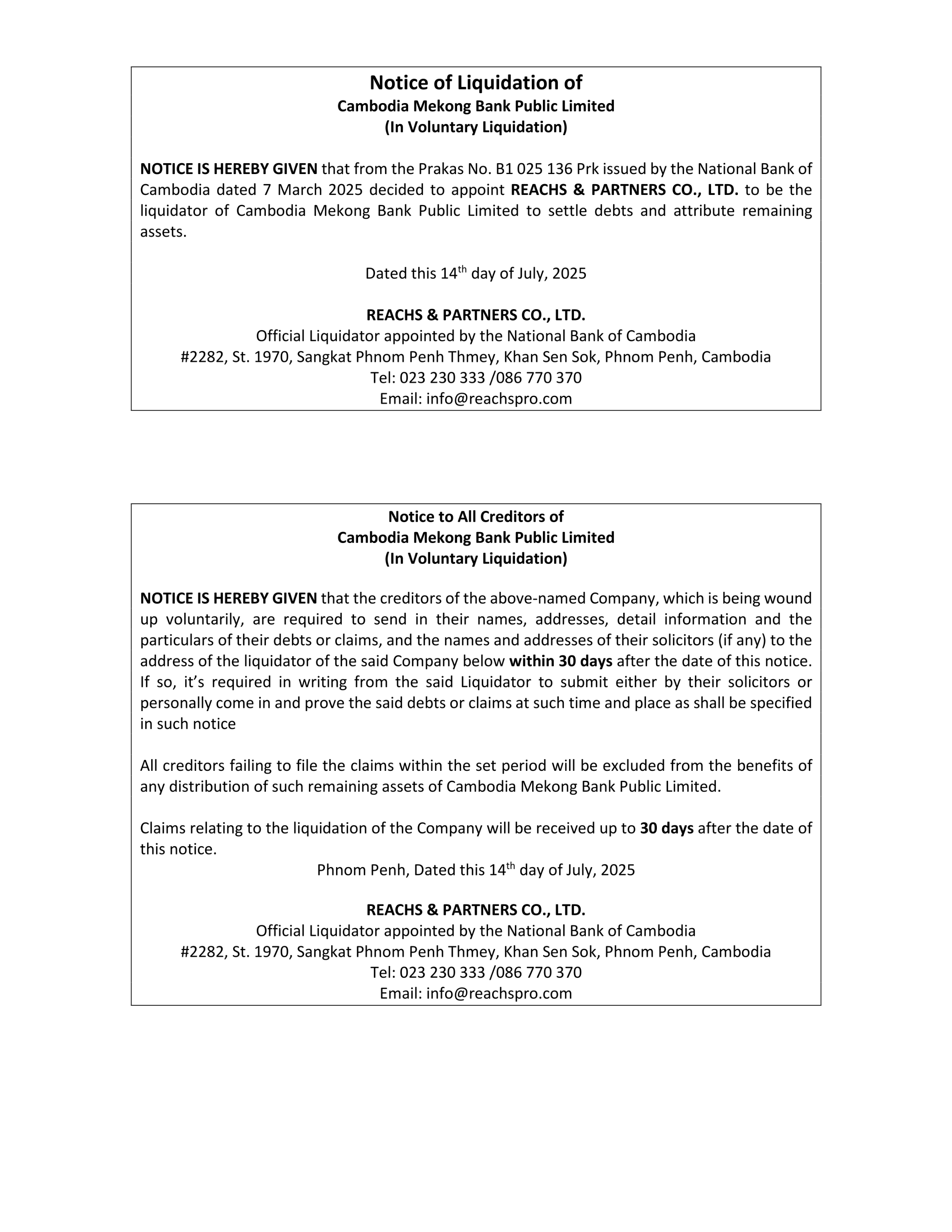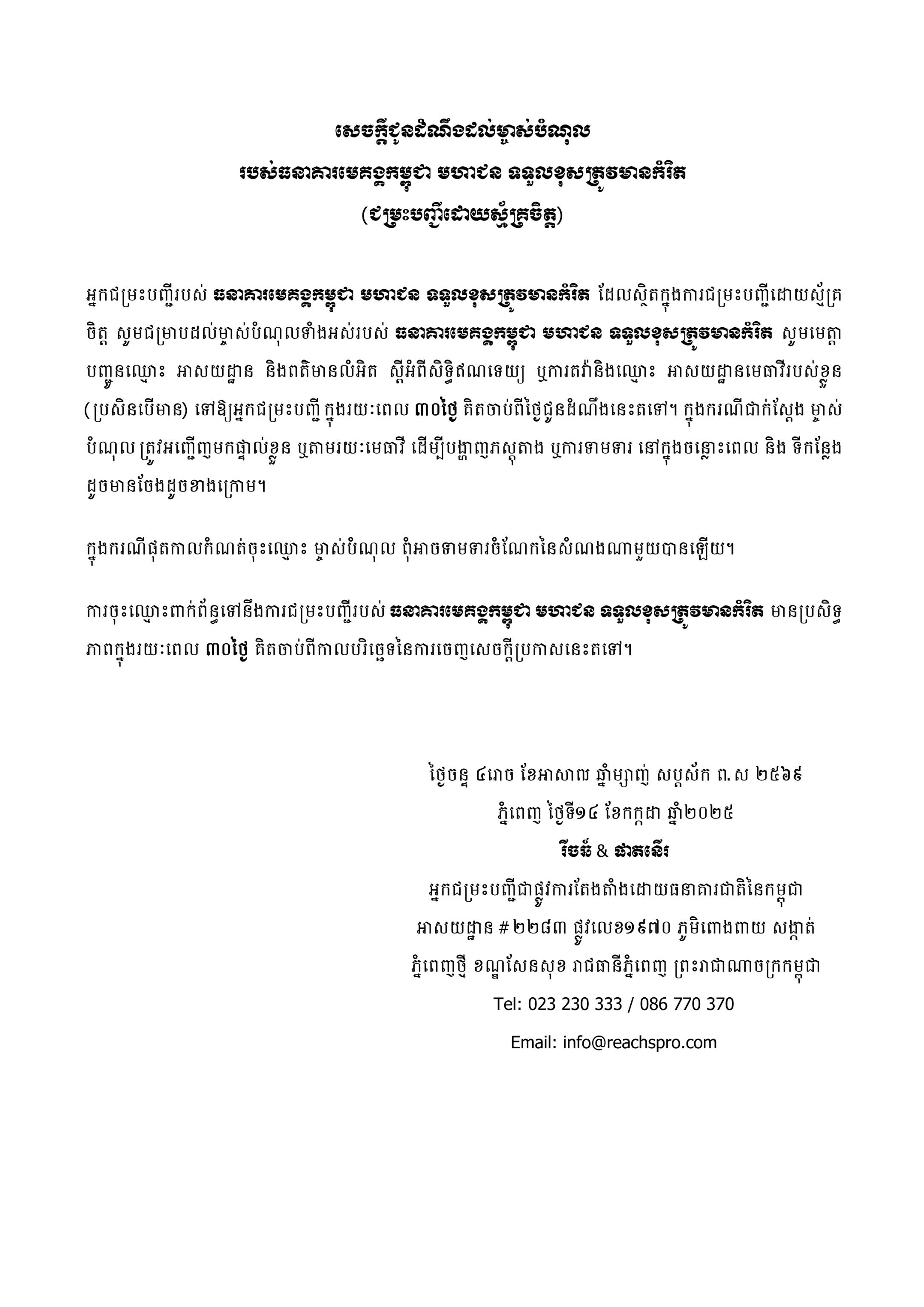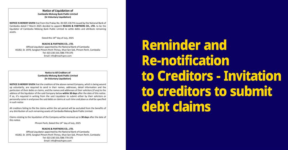 (Phnom Penh): We would like to inform all creditors of Cambodia Mekong Bank Public Limited (CMB) that we have already issued multiple announcements through various media channels. Specifically, to provide an opportunity for creditors who have not received notice and have not yet submitted their debt claims, we would like to issue a further reminder and re-notification. Therefore, all creditors who have not yet submitted their claims are kindly requested to submit a written application clearly stating the nature of the debt, the outstanding amount, and attaching relevant supporting documents (such as account statements or other evidence) within 30 working days, counting from the date of publication of this reminder and re-notification onward.