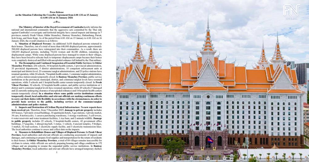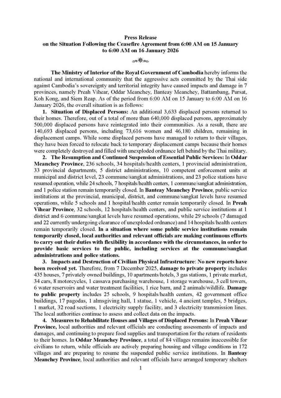 (Phnom Penh): The Cambodian Ministry of Interior released an update on Friday (Jan. 16) regarding the situation following the ceasefire agreement.