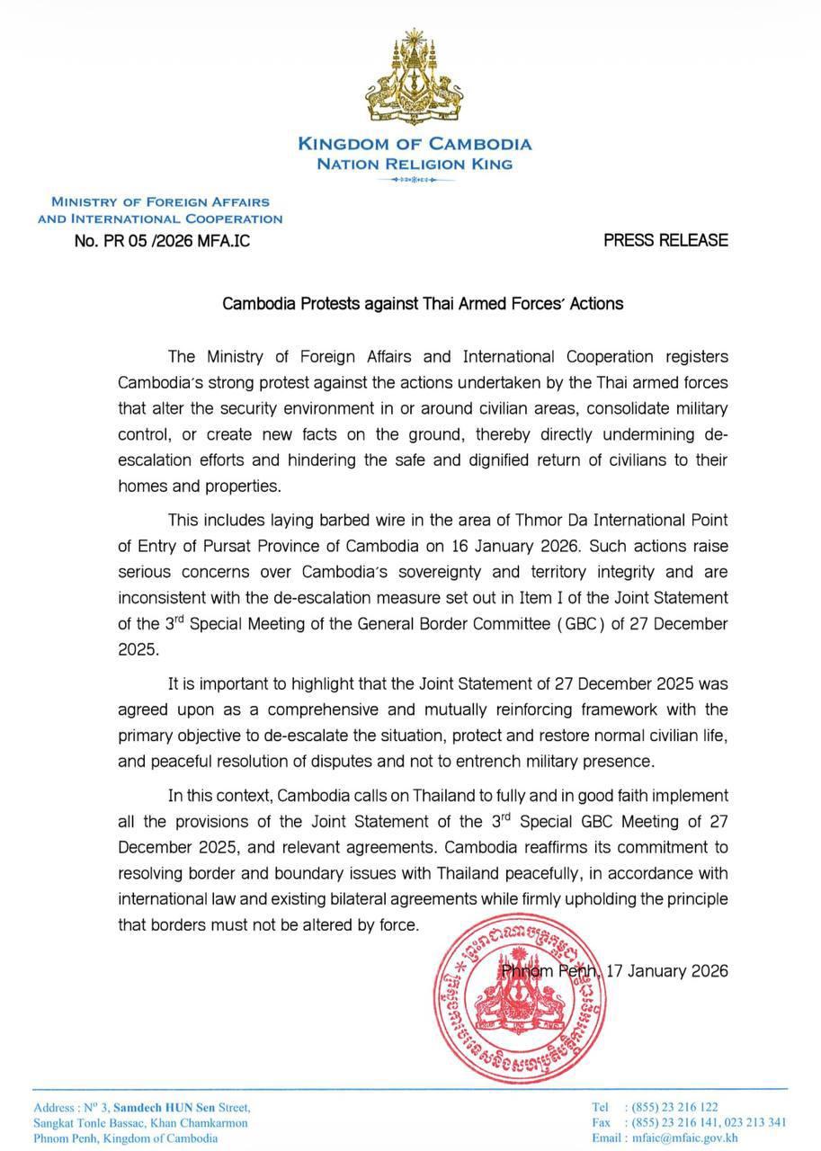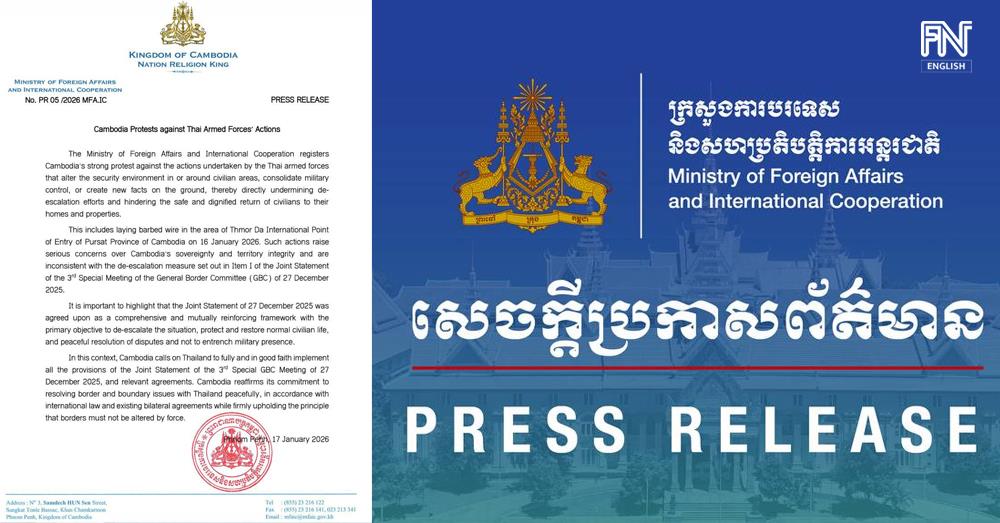 (Phnom Penh): Cambodian Ministry of Foreign Affairs and International Cooperation registered Cambodia's strong protest against the actions undertaken by the Thai armed forces that alter the security environment in or around civilian areas, consolidate military control, or create new facts on the ground, thereby directly undermining de- escalation efforts and hindering the safe and dignified return of civilians to their homes and properties, according to a press release seen by Fresh News on Saturday (Jan. 17).