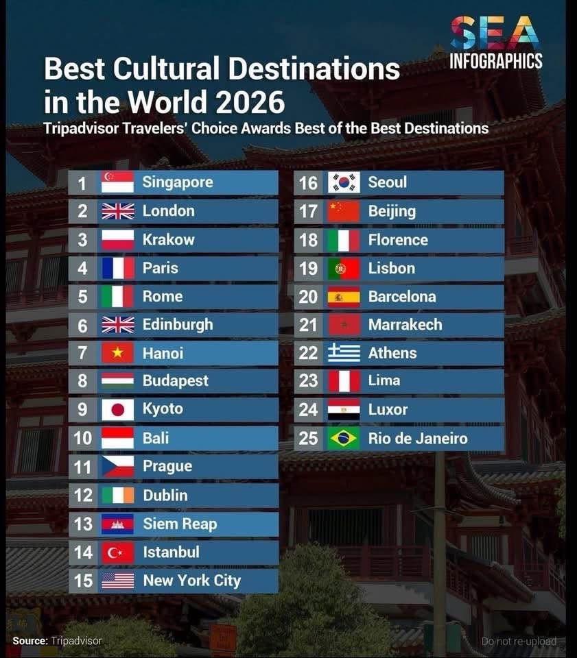 The global travel platform released the rankings on Sunday (Jan. 18), placing Singapore first, followed by London, Krakow, and Paris. Tripadvisor praised Siem Reap as a “profound” cultural destination, highlighting the experience of witnessing Angkor’s ancient temples bathed in early morning light.