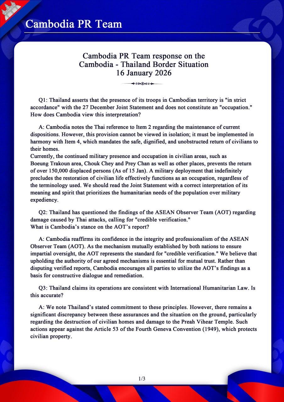 A: Cambodia notes the Thai reference to Item 2 regarding the maintenance of current dispositions. However, this provision cannot be viewed in isolation; it must be implemented in harmony with Item 4, which mandates the safe, dignified, and unobstructed return of civilians to their homes. Currently, the continued military presence and occupation in civilian areas, such as Boeung Trakoun area, Chouk Chey and Prey Chan as well as other places, prevents the return of over 150,000 displaced persons (As of 15 Jan). A military deployment that indefinitely precludes the restoration of civilian life effectively functions as an occupation, regardless of the terminology used. We should read the Joint Statement with a correct interpretation of its meaning and spirit that prioritizes the humanitarian needs of the population over military expediency.
