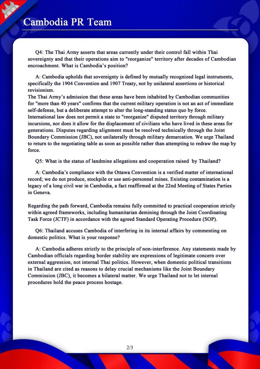 Q4: The Thai Army asserts that areas currently under their control fall within Thai sovereignty and that their operations aim to "reorganize" territory after decades of Cambodian encroachment. What is Cambodia’s position?