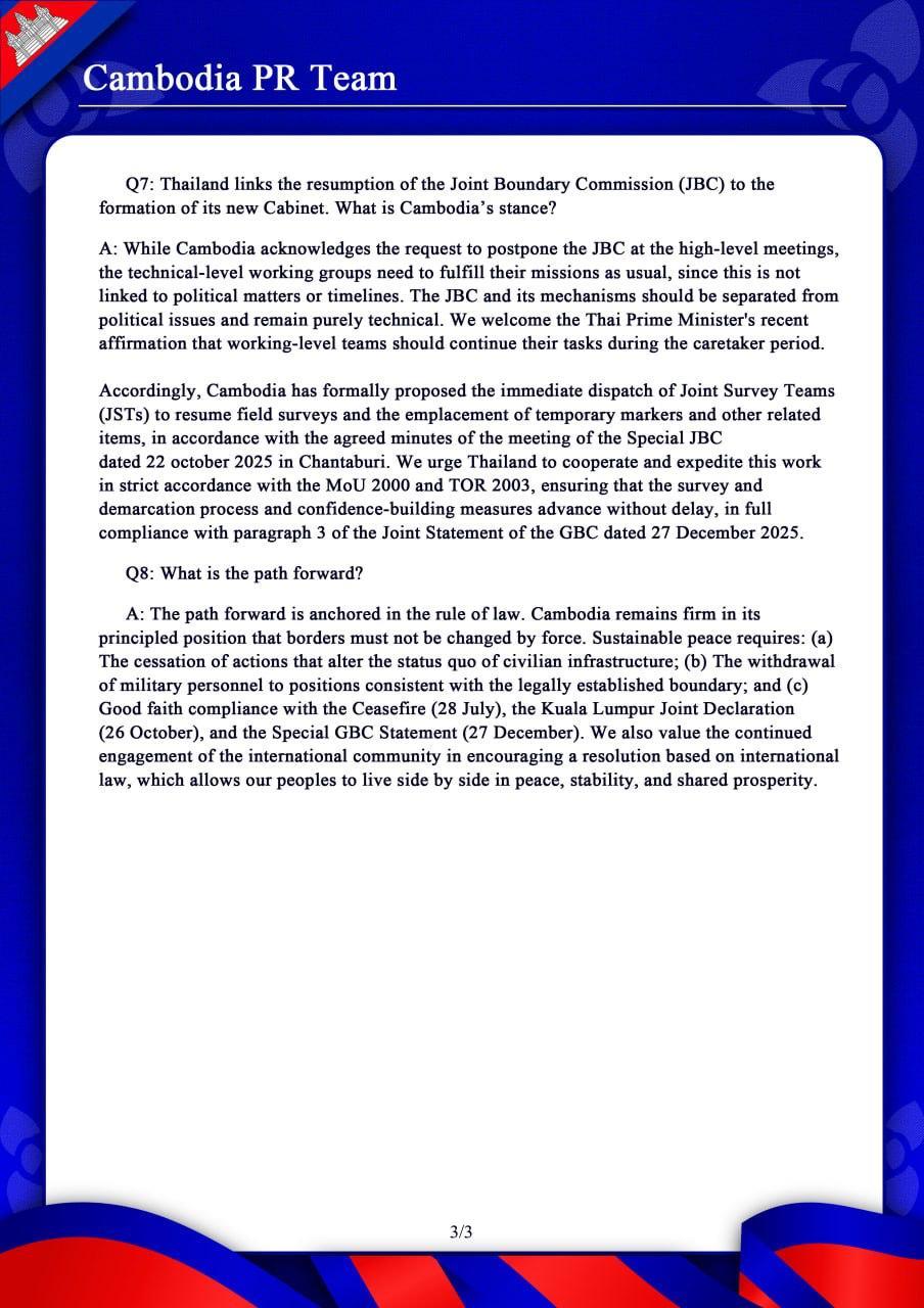 A: While Cambodia acknowledges the request to postpone the JBC at the high-level meetings, the technical-level working groups need to fulfill their missions as usual, since this is not linked to political matters or timelines. The JBC and its mechanisms should be separated from political issues and remain purely technical. We welcome the Thai Prime Minister's recent affirmation that working-level teams should continue their tasks during the caretaker period. Accordingly, Cambodia has formally proposed the immediate dispatch of Joint Survey Teams (JSTs) to resume field surveys and the emplacement of temporary markers and other related items, in accordance with the agreed minutes of the meeting of the Special JBC dated 22 October 2025 in Chantaburi. We urge Thailand to cooperate and expedite this work in strict accordance with the MoU 2000 and TOR 2003, ensuring that the survey and demarcation process and confidence-building measures advance without delay, in full compliance with paragraph 3 of the Joint Statement of the GBC dated 27 December 2025.