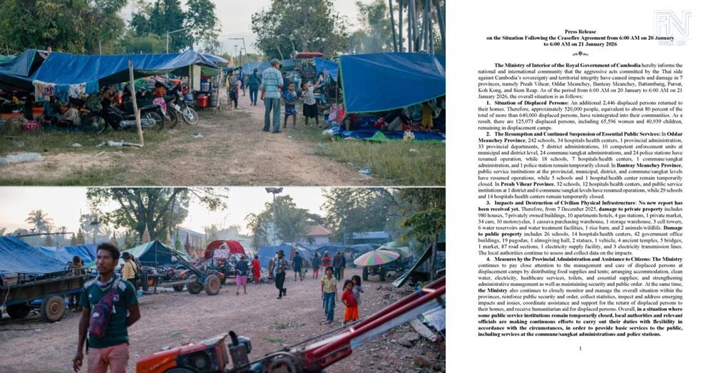 (Phnom Penh): The Cambodian Ministry of Interior released an update on Wednesday (Jan. 21) regarding the situation following the ceasefire agreement.