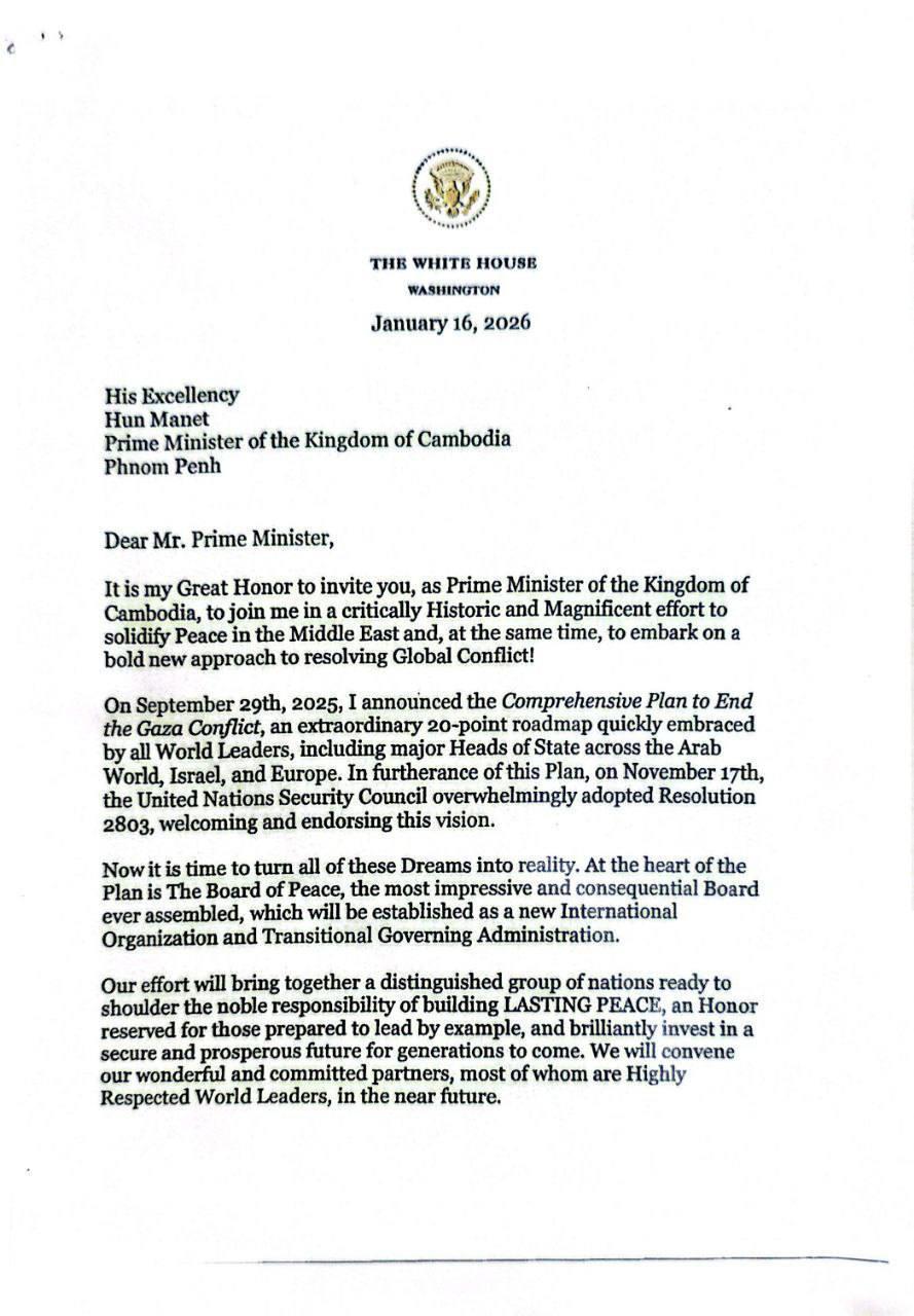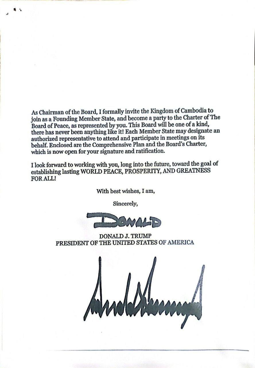 (Phnom Penh): Cambodian Prime Minister Hun Manet received an official invitation from Donald J. Trump, President of the United States of America, to join as a Founding Member State and become a party to the Charter of the Board of Peace, according to the letter seen by Fresh News on Thursday (Jan. 22).