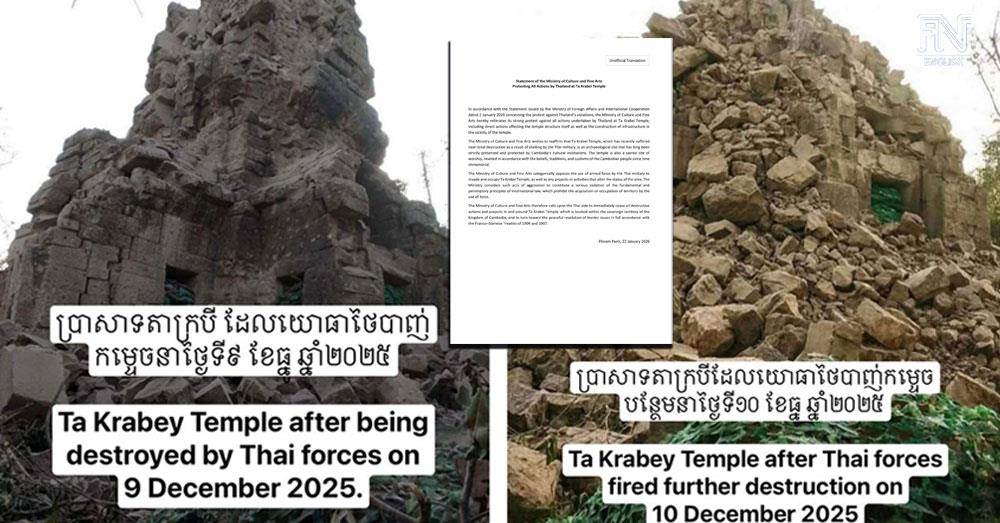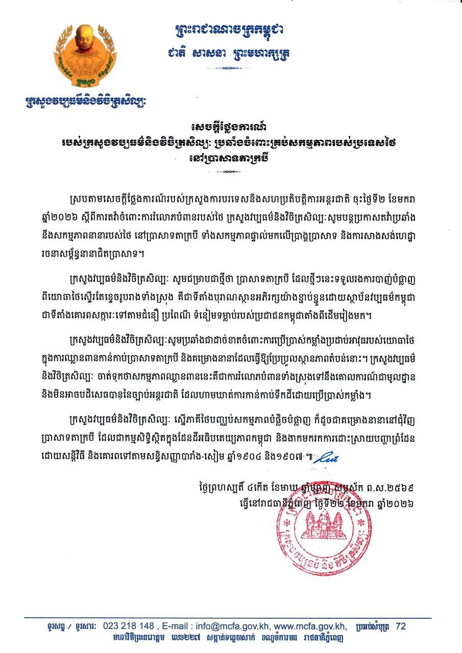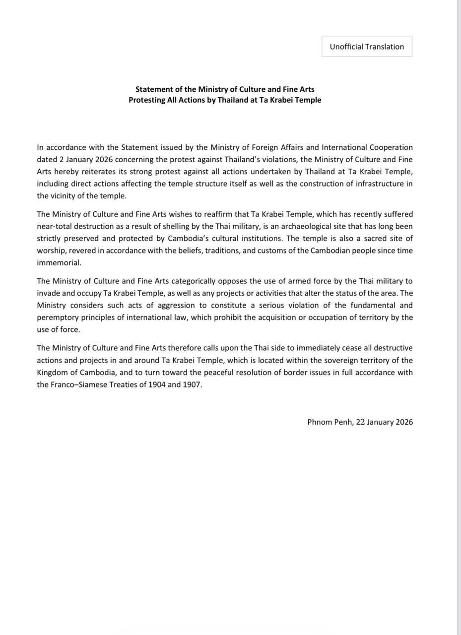 (Phnom Penh): The Ministry of Culture and Fine Arts of the Kingdom of Cambodia issued a statement on Thursday (Jan. 22) expressing a strong protest against all actions undertaken by the Thai military at Ta Krabei Temple.