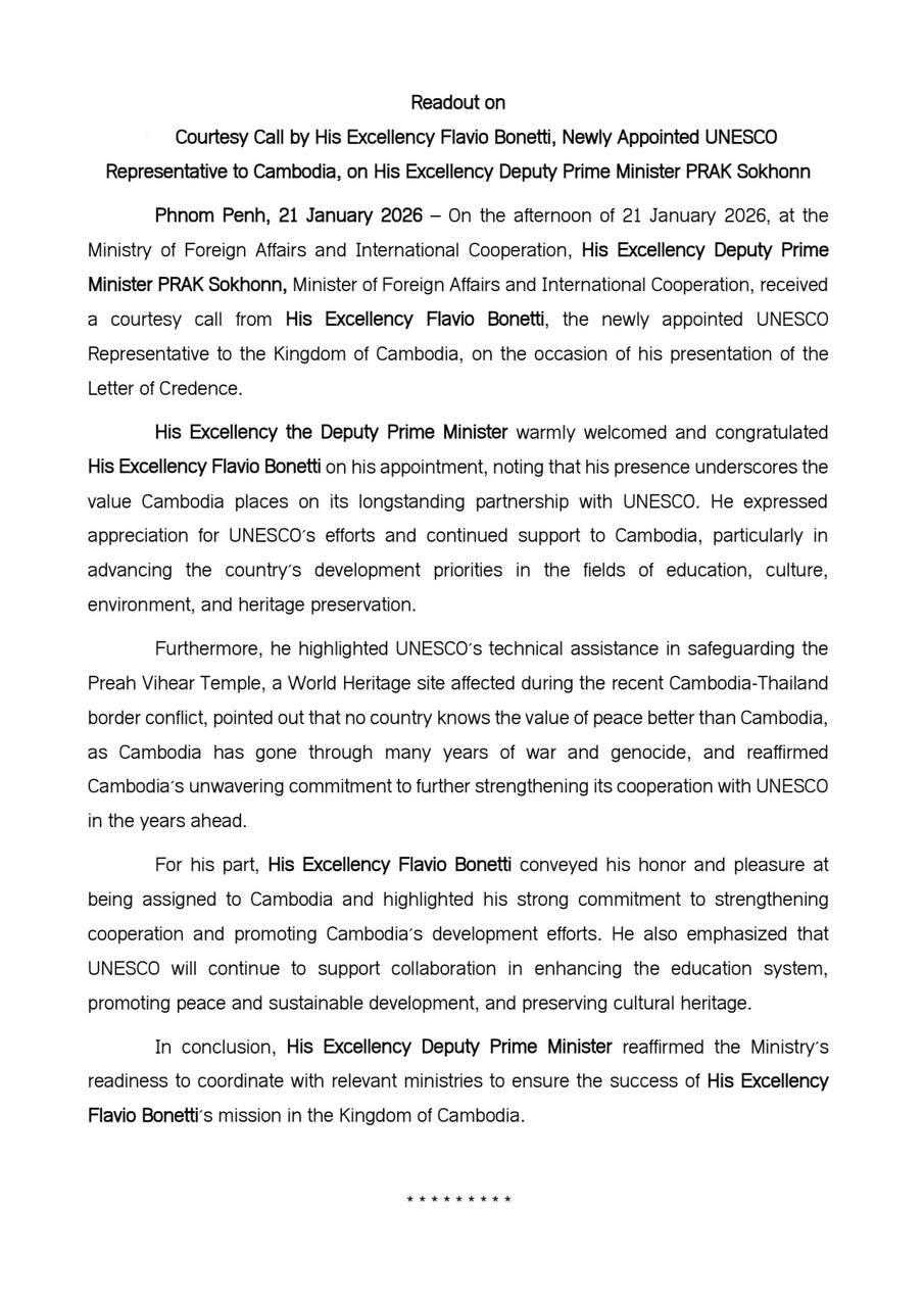 (Phnom Penh): On the afternoon of 21 January 2026, at the Ministry of Foreign Affairs and International Cooperation, Cambodian Foreign Minister Prak Sokhonn received a courtesy call from Flavio Bonetti, newly appointed UNESCO Representative to the Kingdom of Cambodia, on the occasion of his presentation of the Letter of Credence.
