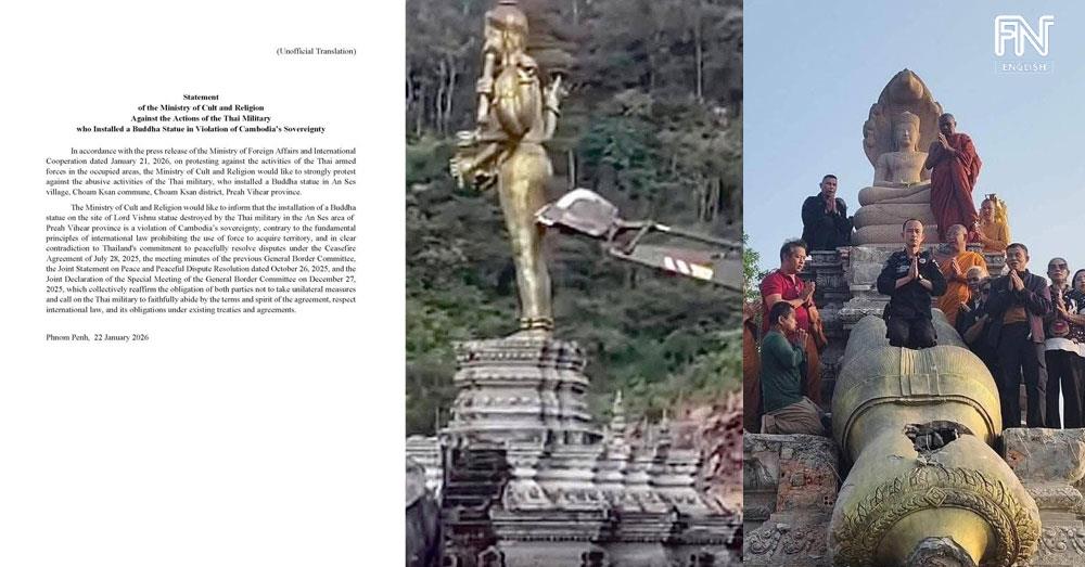 (Phnom Penh): The Ministry of Cults and Religion of the Kingdom of Cambodia issued a statement on Thursday (Jan. 22) expressing a strong protest against the abusive activities of the Thai military, who installed a Buddha statue in An Ses village, Choam Ksan commune, Choam Ksan district, Preah Vihear province.