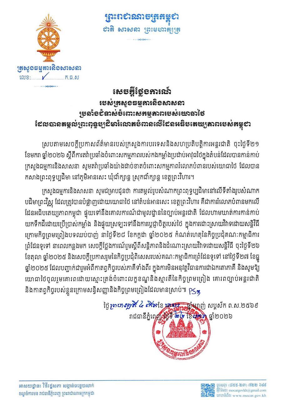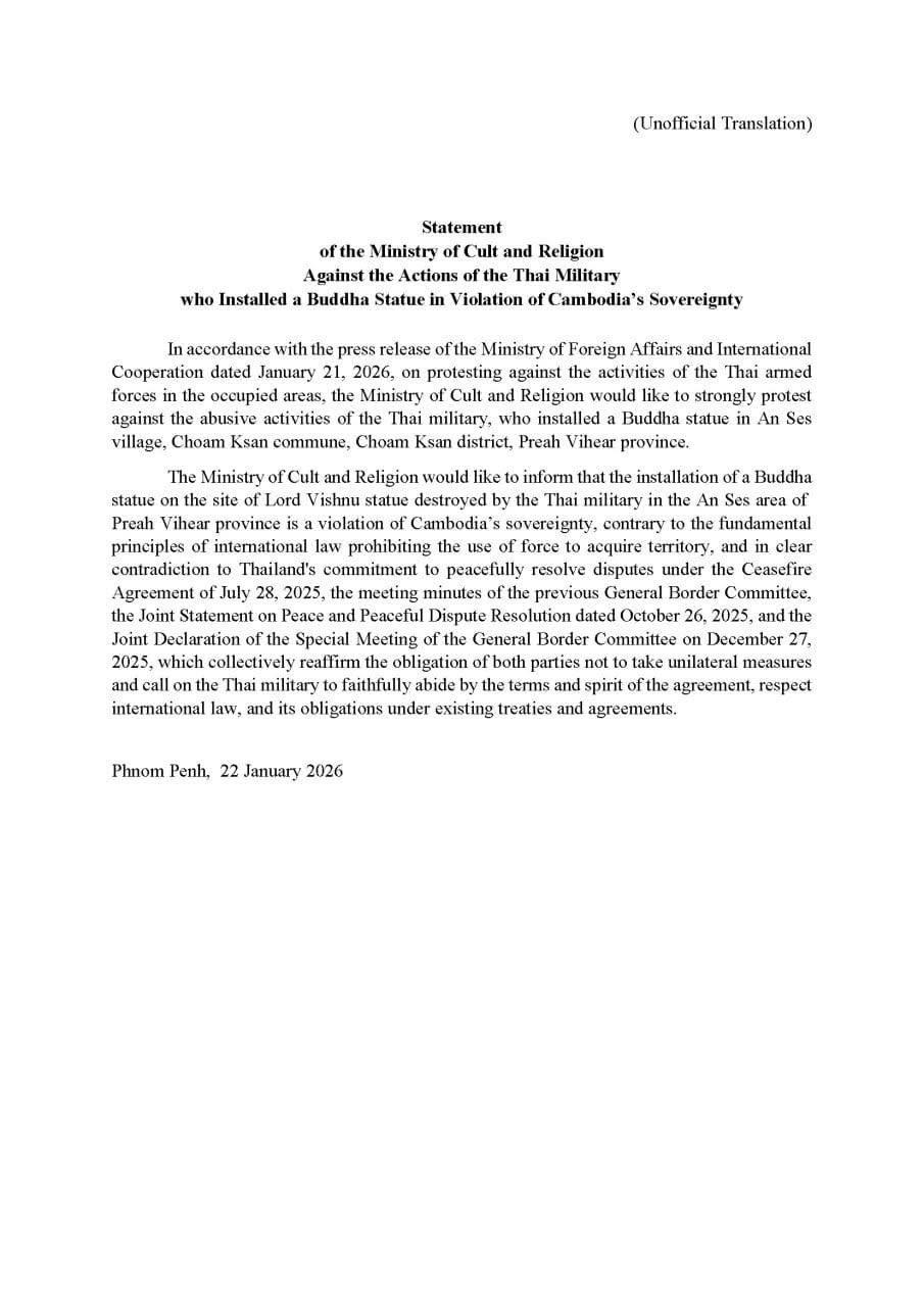 The ministry reiterated its position in line with the press release of the Ministry of Foreign Affairs and International Cooperation dated on 21 January 2026 on protesting against the activities of the Thai armed forces in the occupied areas. The ministry strongly protested against the abusive activities of the Thai military, who installed a Buddha statue in An Ses village, Choam Ksan commune, Choam Ksan district, Preah Vihear province.