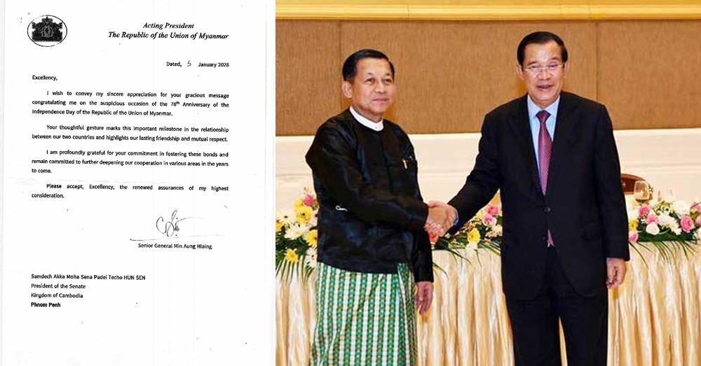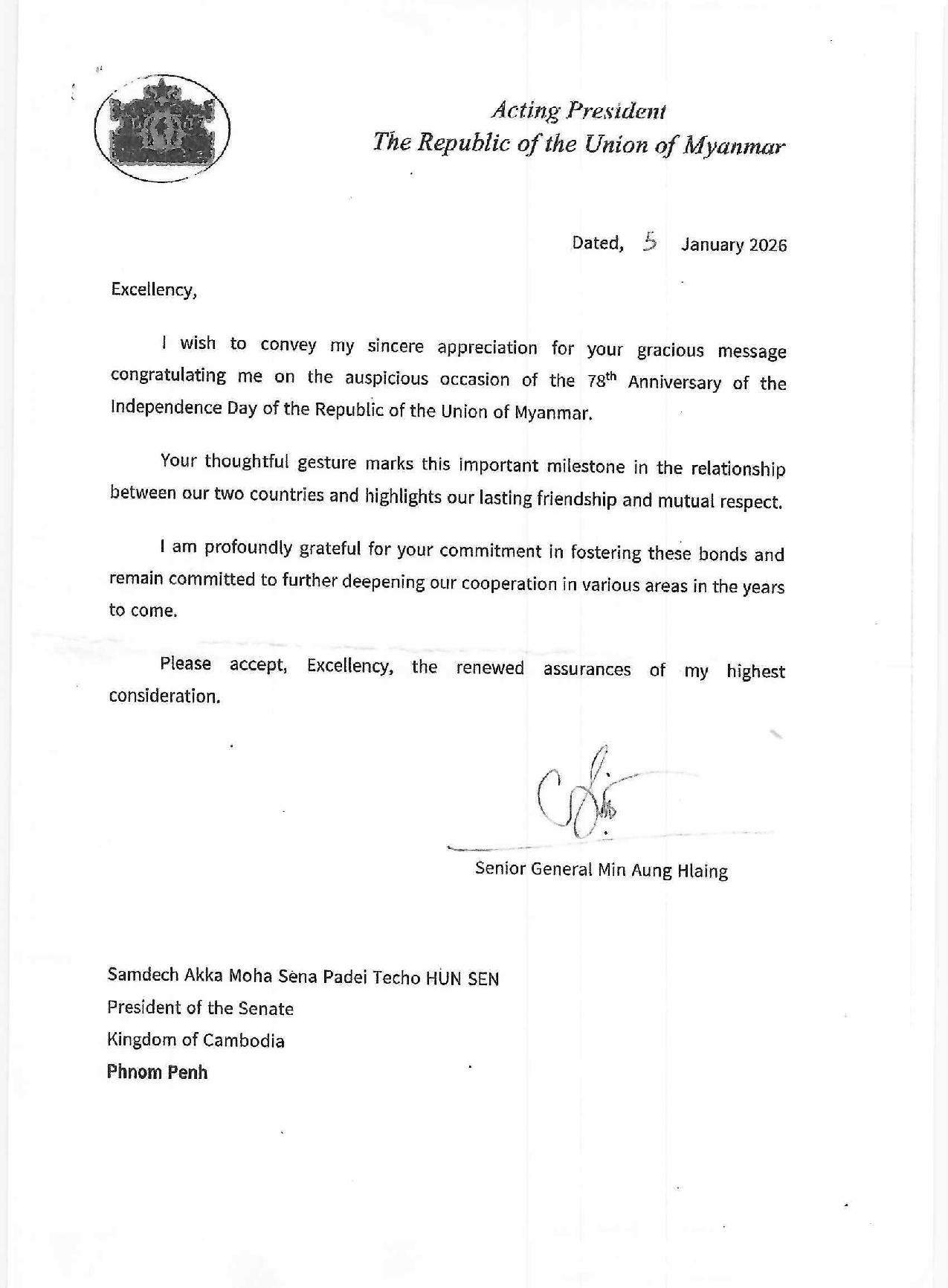 (Phnom Penh): Senior General Min Aung Hlaing, Acting President of the Republic of the Union of Myanmar, thanked Cambodian Senate President Hun Sen for his congratulatory letter on the auspicious occasion of the 78th Anniversary of the Independence Day of the Republic of the Union of Myanmar.