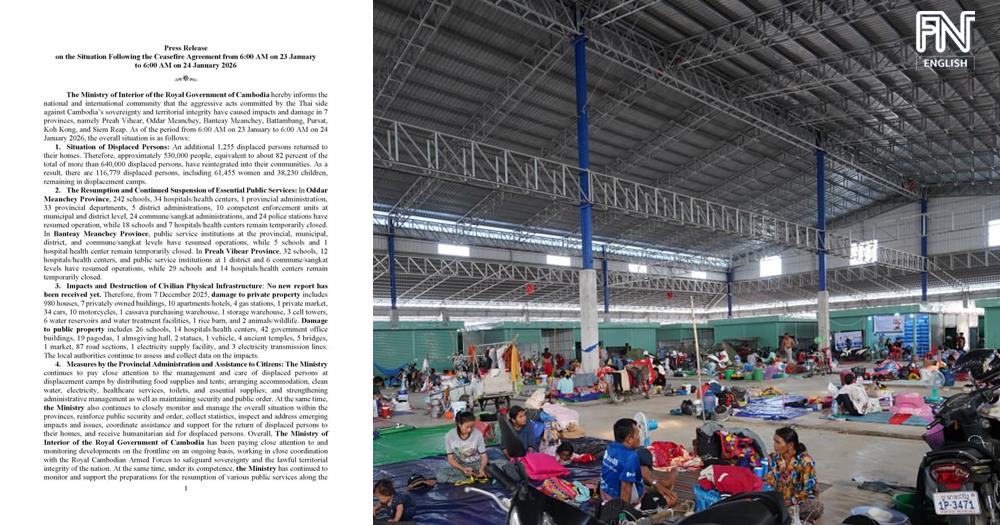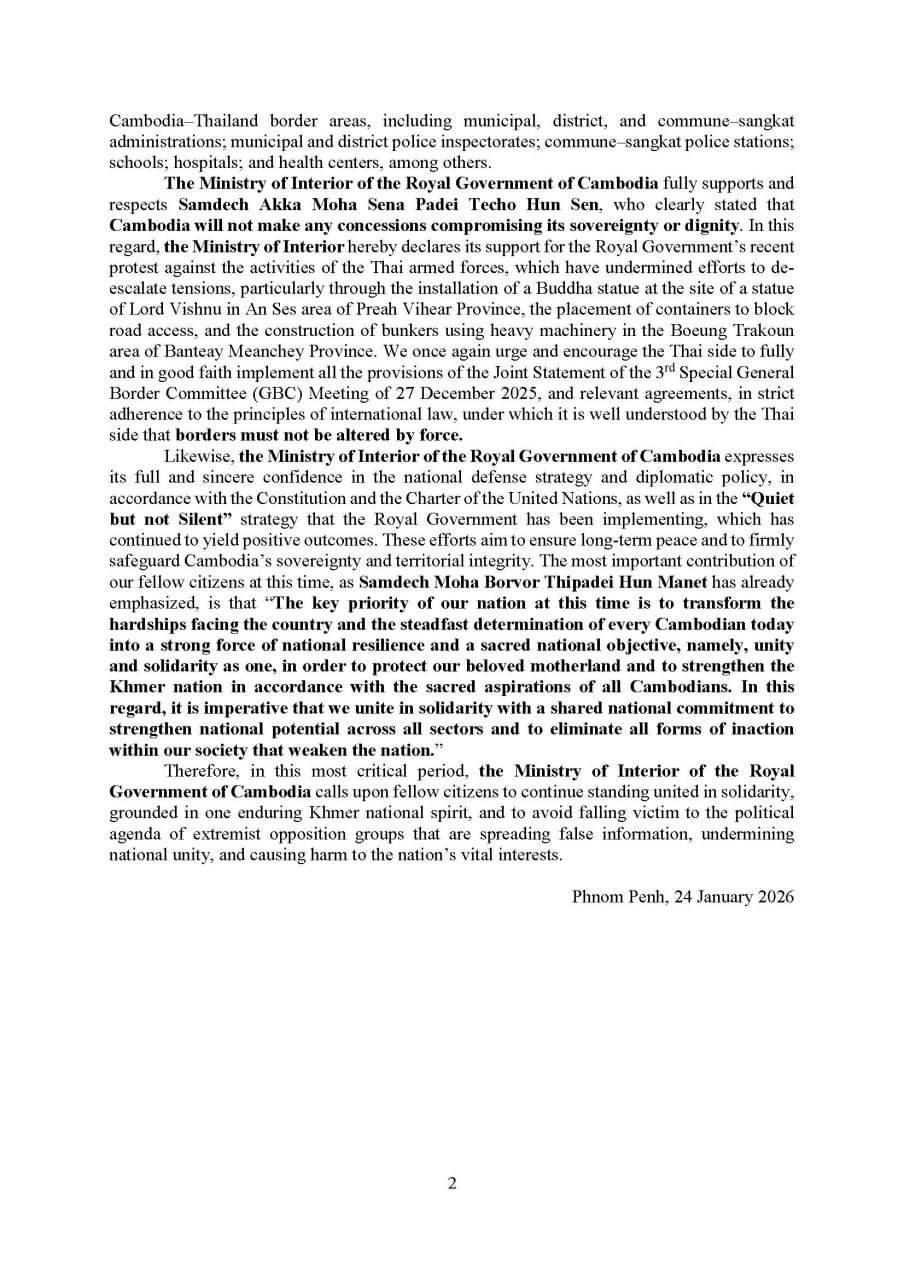 (Phnom Penh): The Cambodian Ministry of Interior issued an update on Saturday (Jan. 24) concerning the situation following the ceasefire agreement.