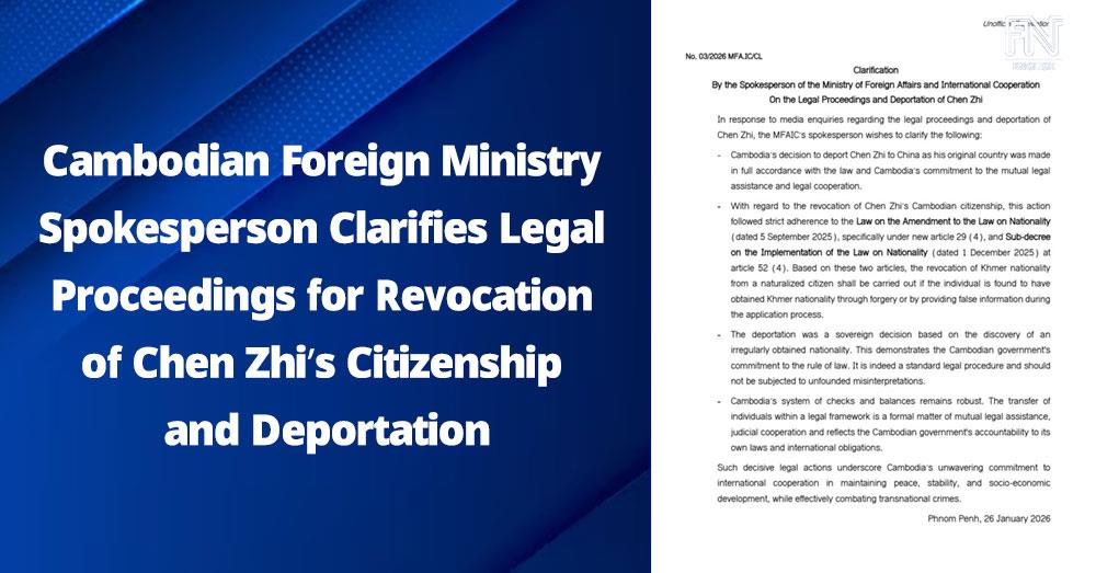 (Phnom Penh): According to a clarification seen by Fresh News on Tuesday (Jan. 27), in response to media enquiries regarding the legal proceedings and deportation of Chen Zhi, the spokesperson of the Ministry of Foreign Affairs and International Cooperation wishes to clarify the following: