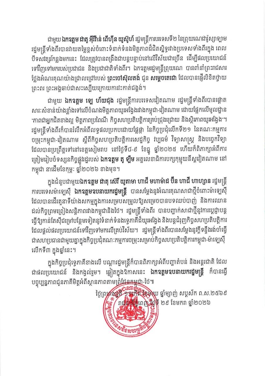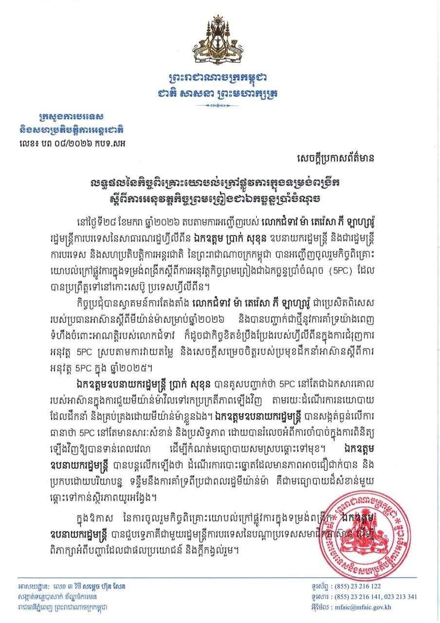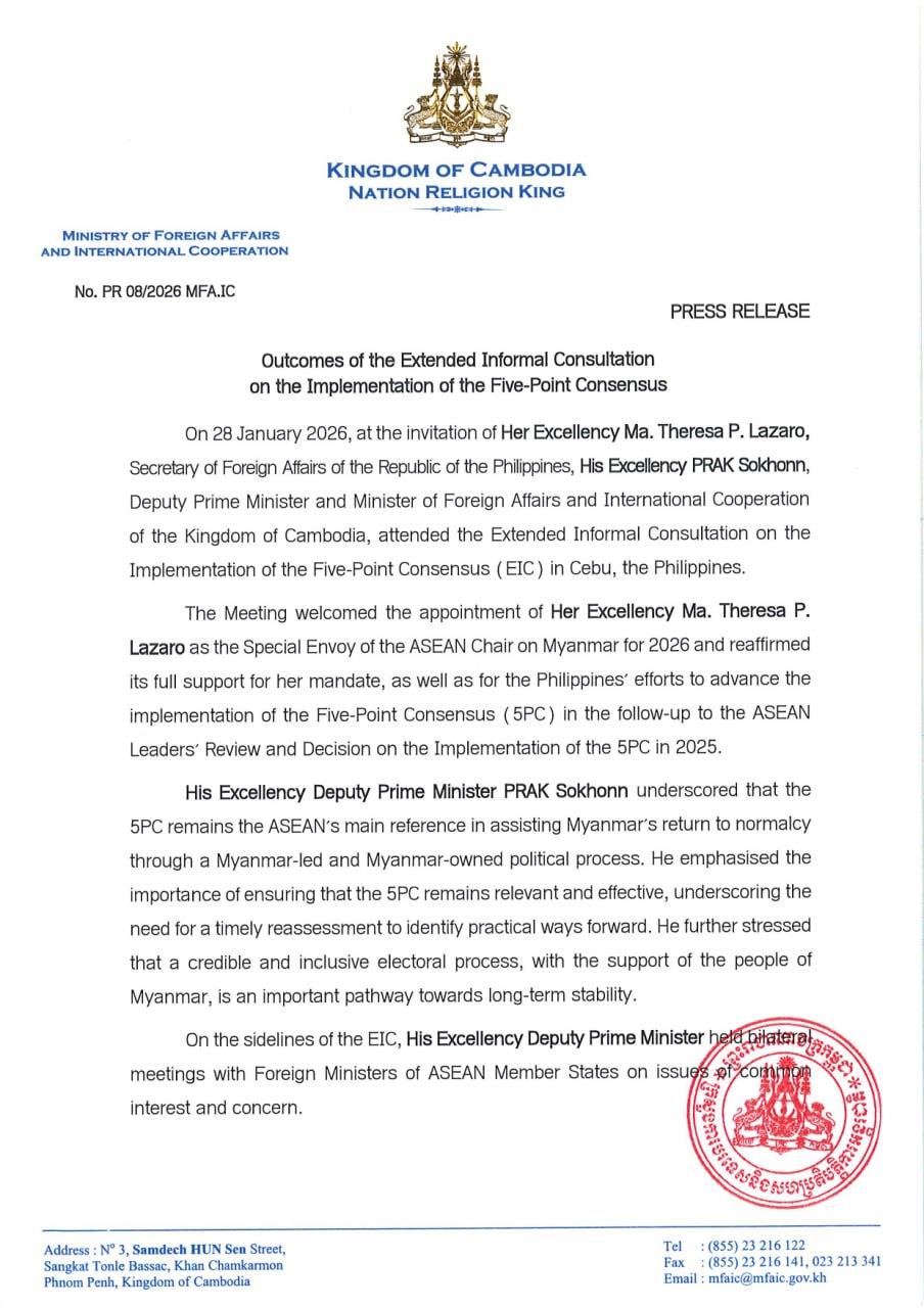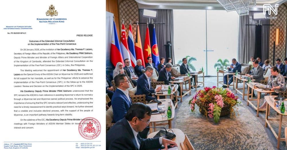 (Phnom Penh): On 28 January 2026, at the invitation of Ma. Theresa P. Lazaro, Secretary of Foreign Affairs of the Republic of the Philippines, Cambodian Foreign Minister Prak Sokhonn attended the Extended Informal Consultation on the Implementation of the Five-Point Consensus (EIC) in Cebu, the Philippines, according to the press release seen by Fresh News on Thursday (Jan. 29).