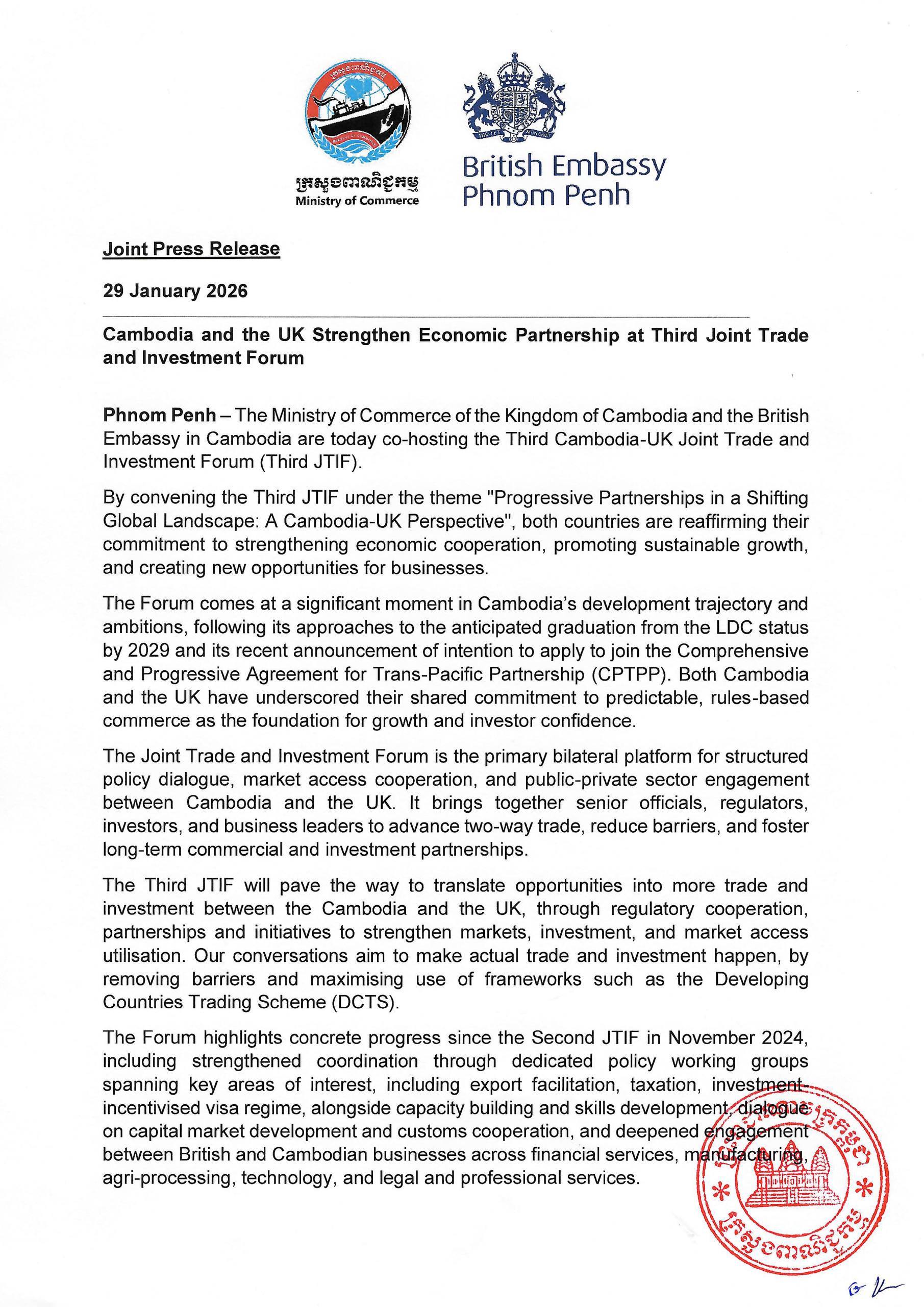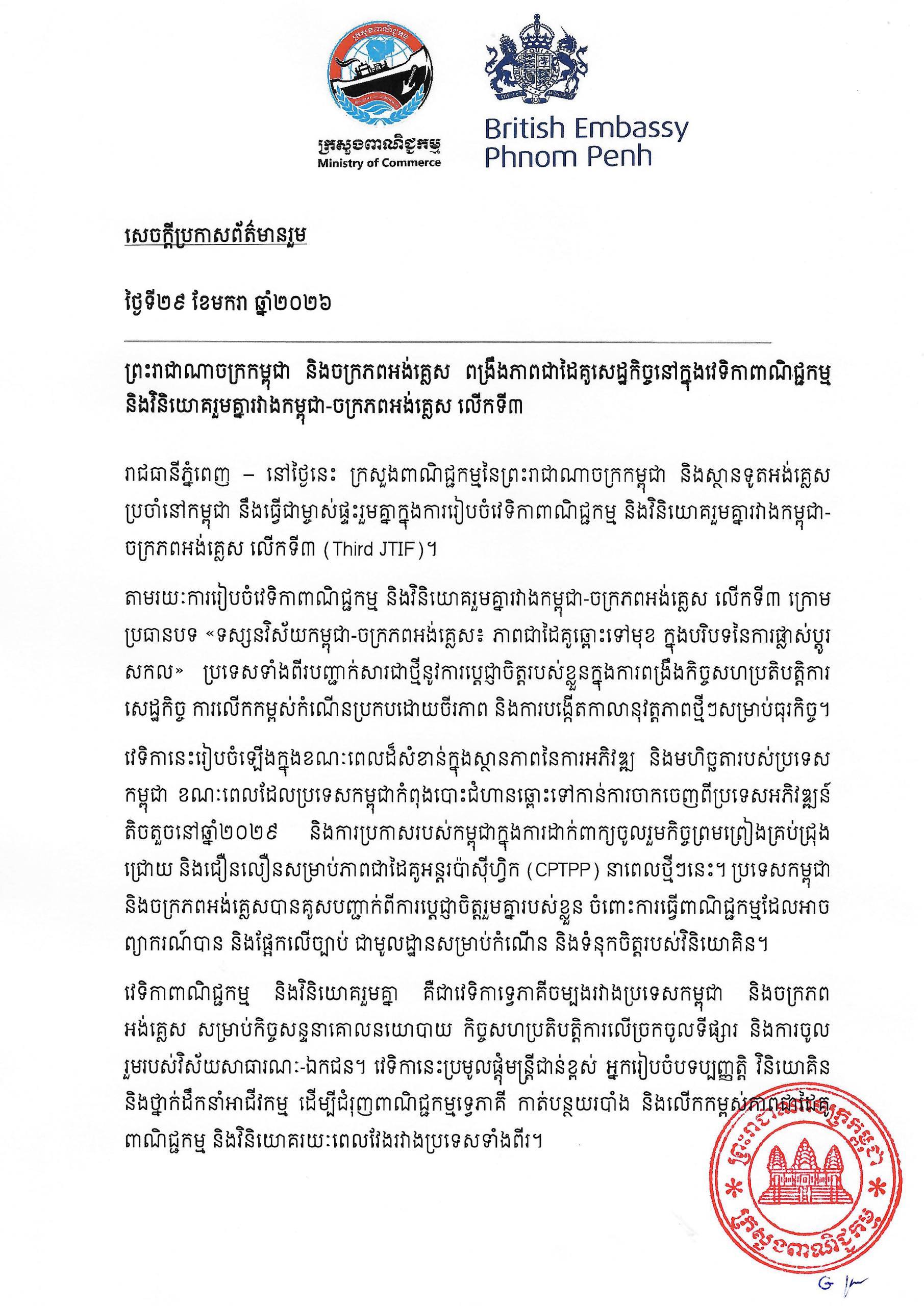 (Phnom Penh): The Ministry of Commerce of the Kingdom of Cambodia and the British Embassy in Cambodia are today co-hosting the Third Cambodia-UK Joint Trade and Investment Forum (Third JTIF).