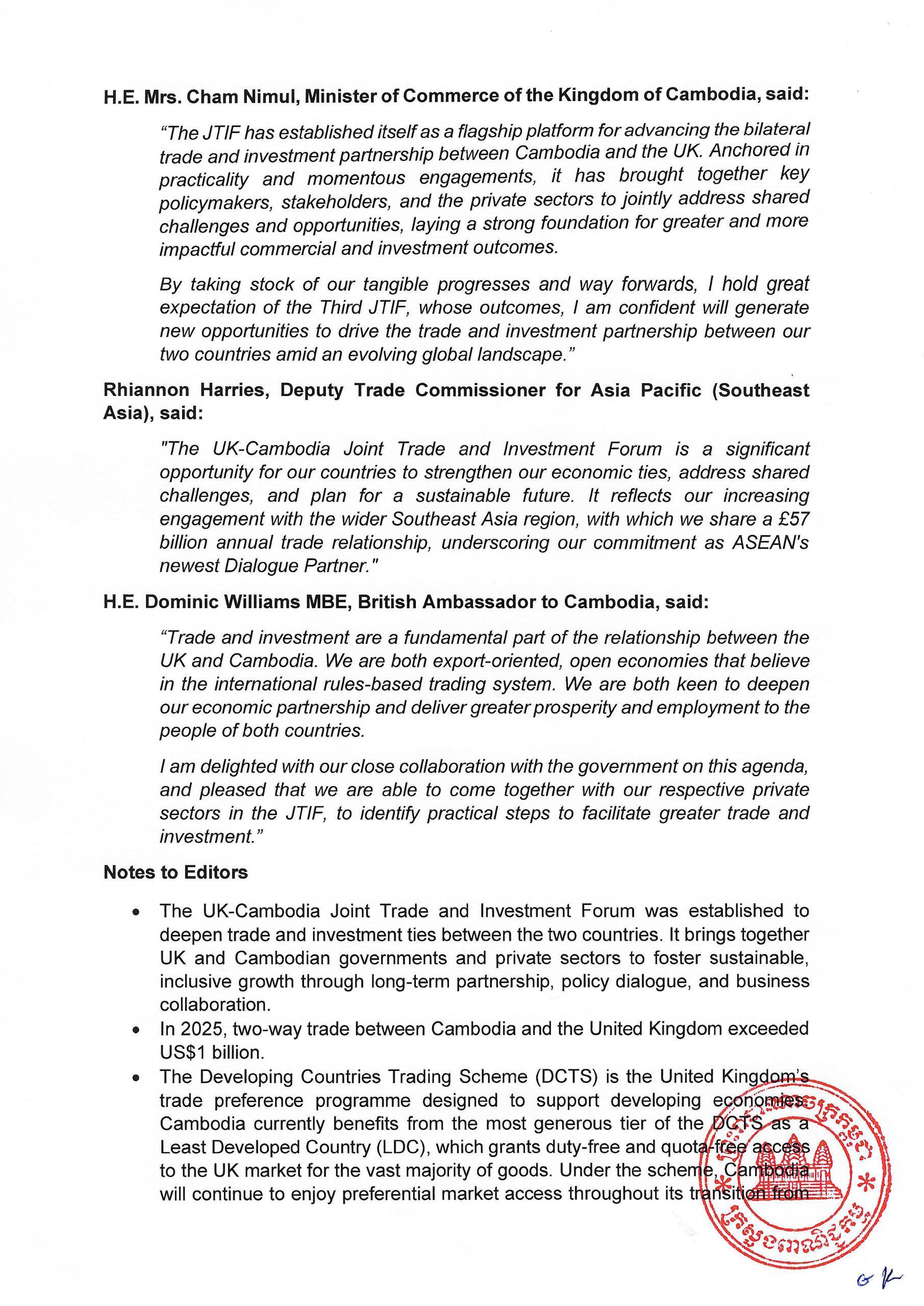 Cham Nimul, Minister of Commerce of the Kingdom of Cambodia, said: "The JTIF has established itself as a flagship platform for advancing the bilateral trade and investment partnership between Cambodia and the UK. Anchored in practicality and momentous engagements, it has brought together key policymakers, stakeholders, and the private sectors to jointly address shared challenges and opportunities, laying a strong foundation for greater and more impactful commercial and investment outcomes. By taking stock of our tangible progresses and way forwards, I hold great expectation of the Third JTIF, whose outcomes, I am confident will generate new opportunities to drive the trade and investment partnership between our two countries amid an evolving global landscape."