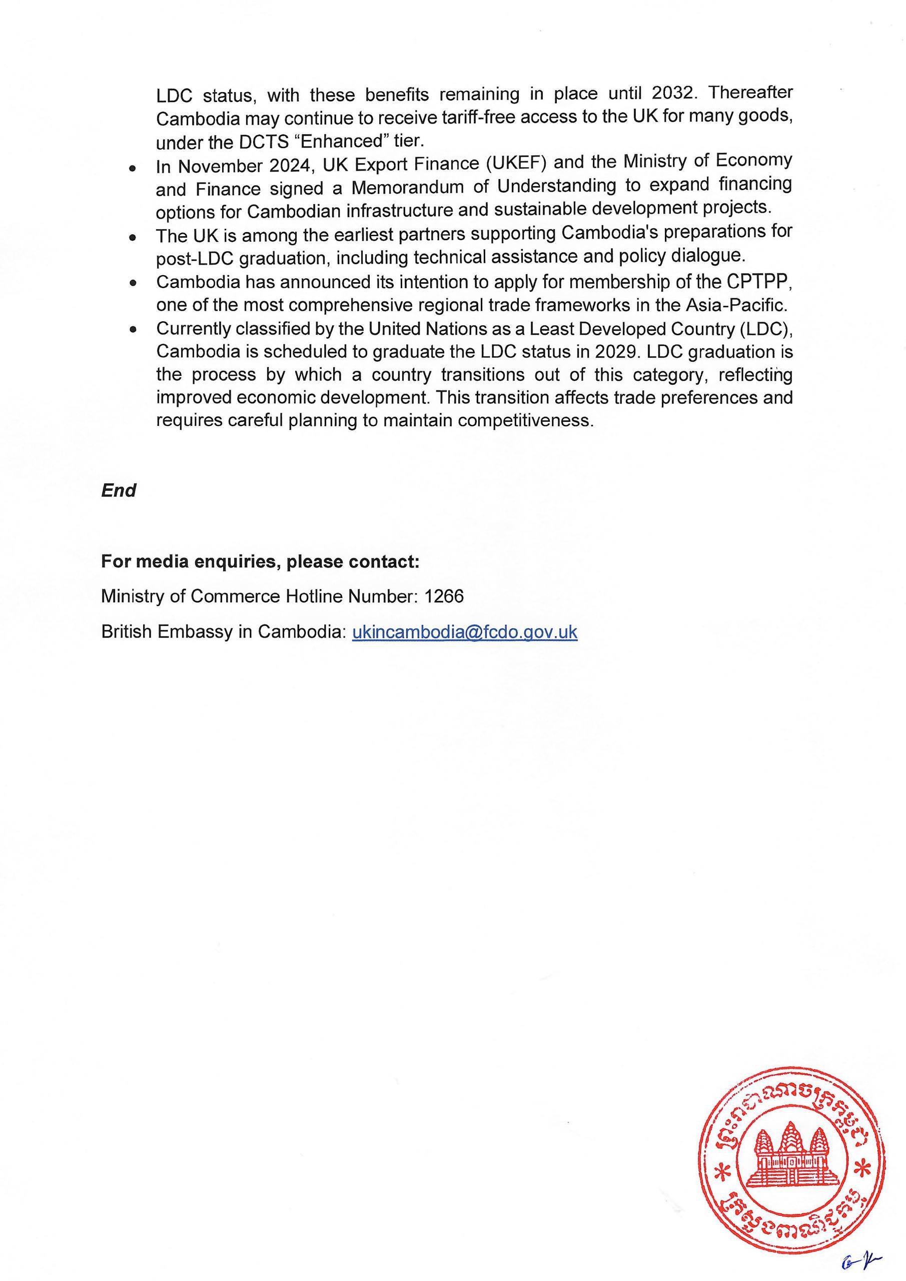 The Forum comes at a significant moment in Cambodia's development trajectory and ambitions, following its approaches to the anticipated graduation from the LDC status by 2029 and its recent announcement of intention to apply to join the Comprehensive and Progressive Agreement for Trans-Pacific Partnership (CPTPP). Both Cambodia and the UK have underscored their shared commitment to predictable, rules-based commerce as the foundation for growth and investor confidence.