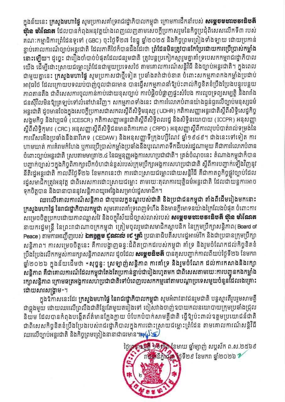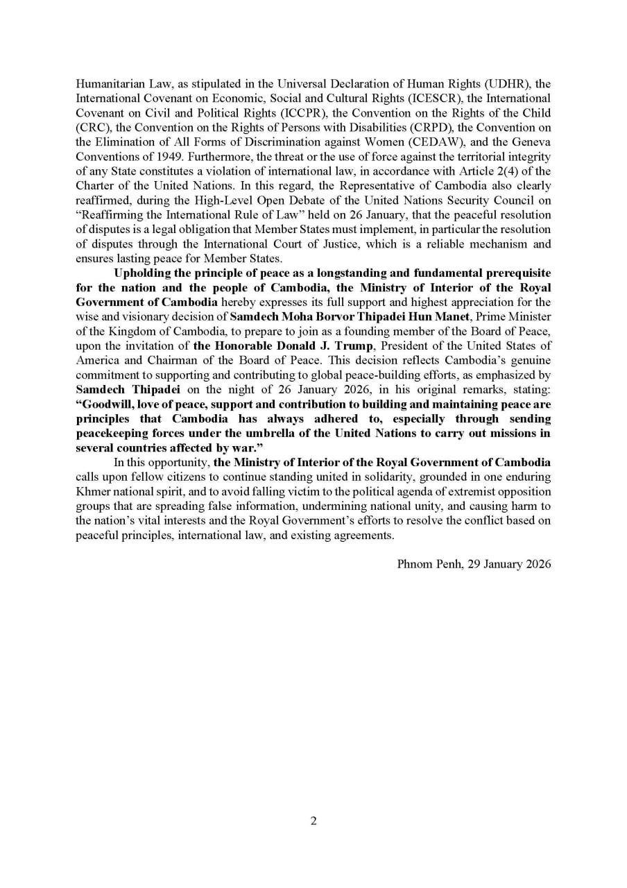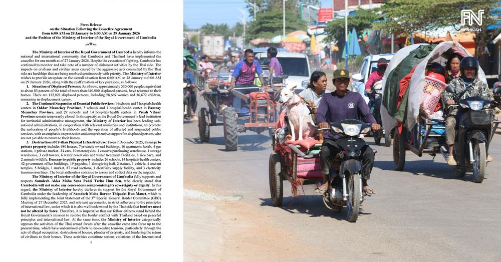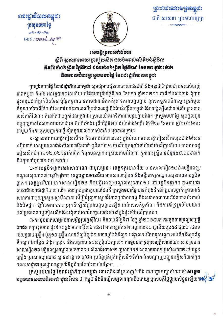 (Phnom Penh): The Cambodian Ministry of Interior issued an update on Thursday (Jan. 29) concerning the situation following the ceasefire agreement.