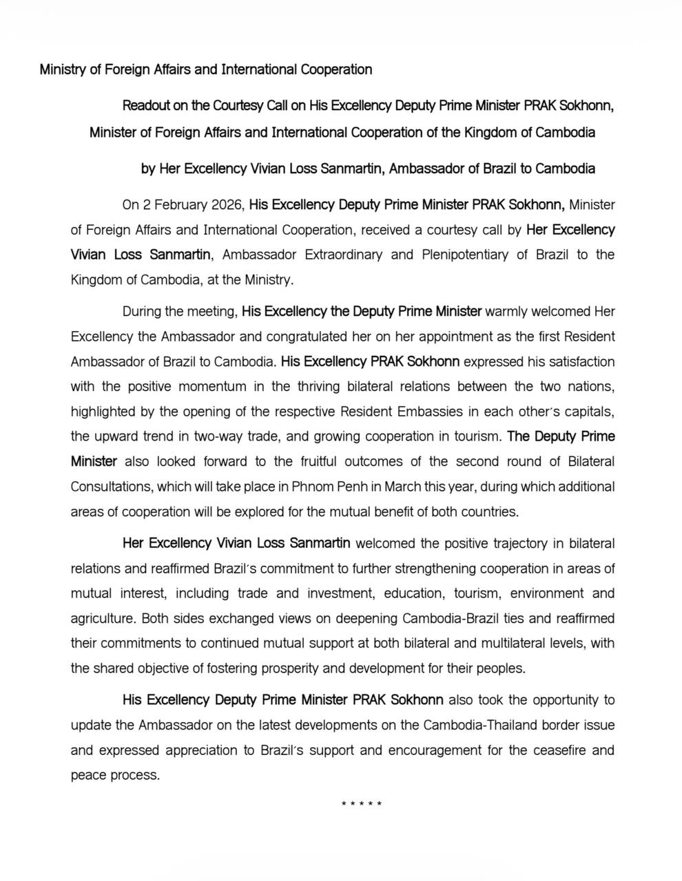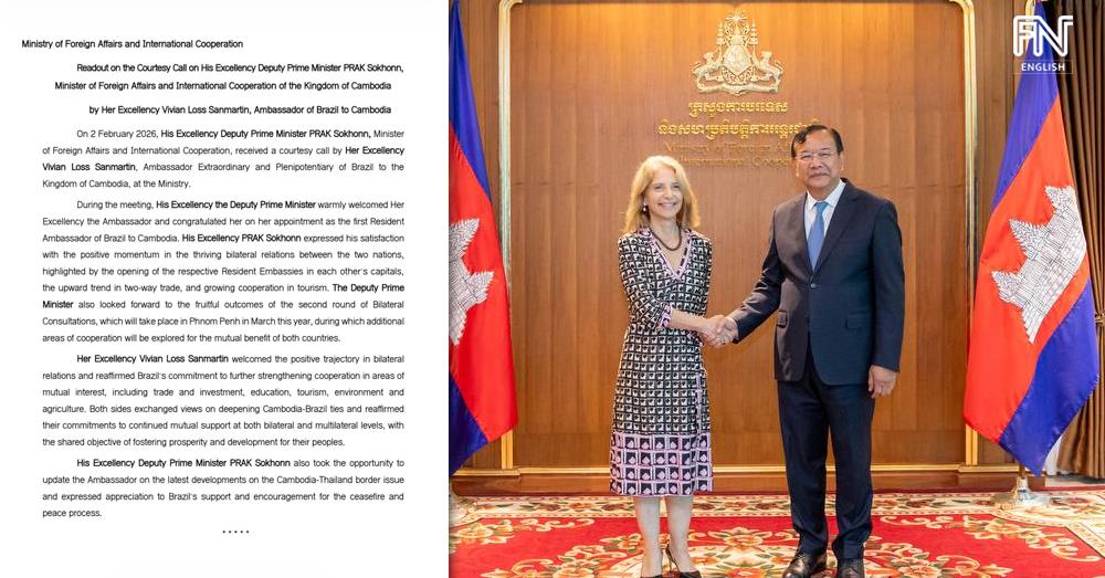 (Phnom Penh): On 2 February 2026, Cambodian Foreign Minister Prak Sokhonn received a courtesy call by Vivian Loss Sanmartin, Ambassador Extraordinary and Plenipotentiary of Brazil to Cambodia, at the Ministry of Foreign Affairs and International Cooperation.
