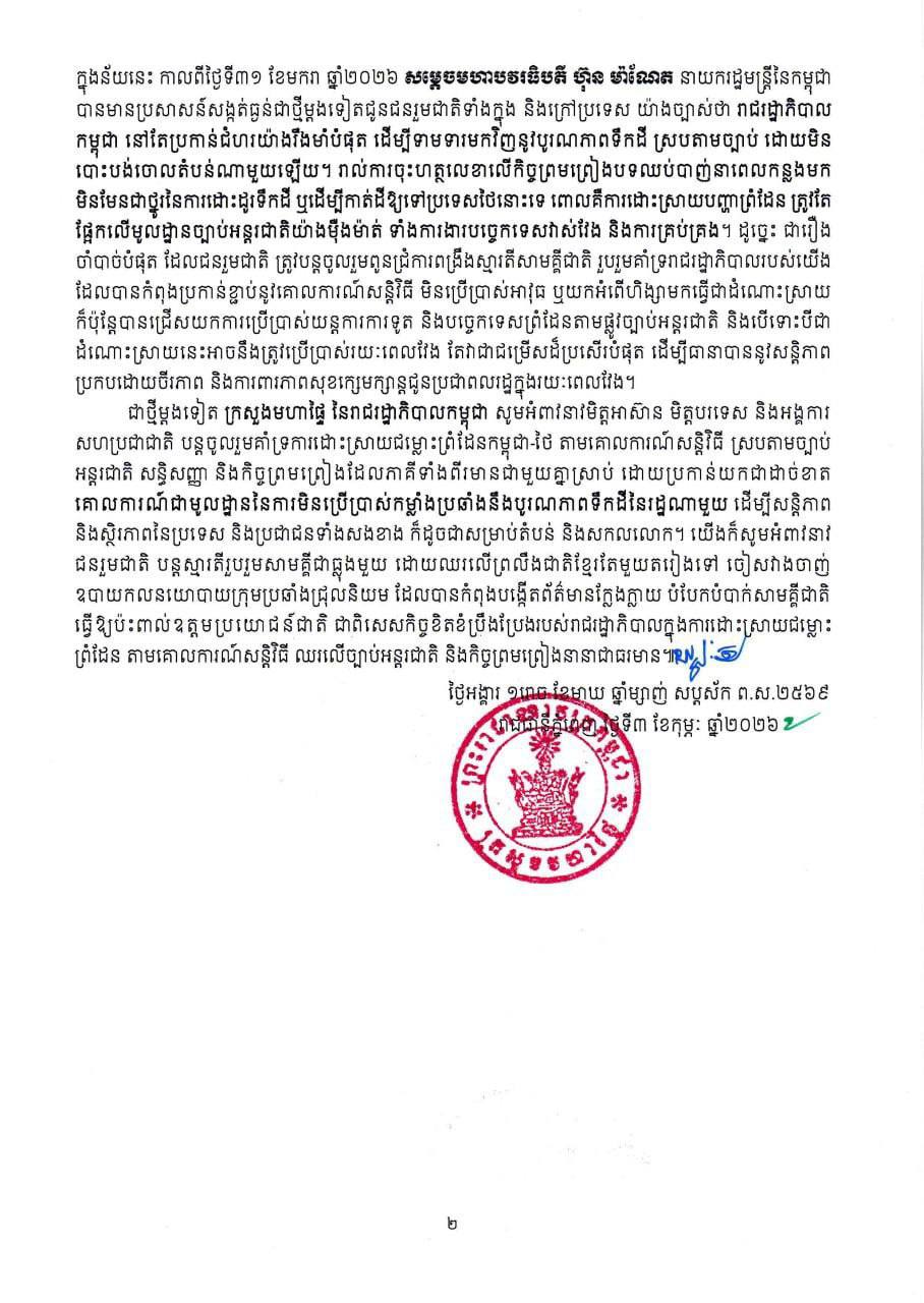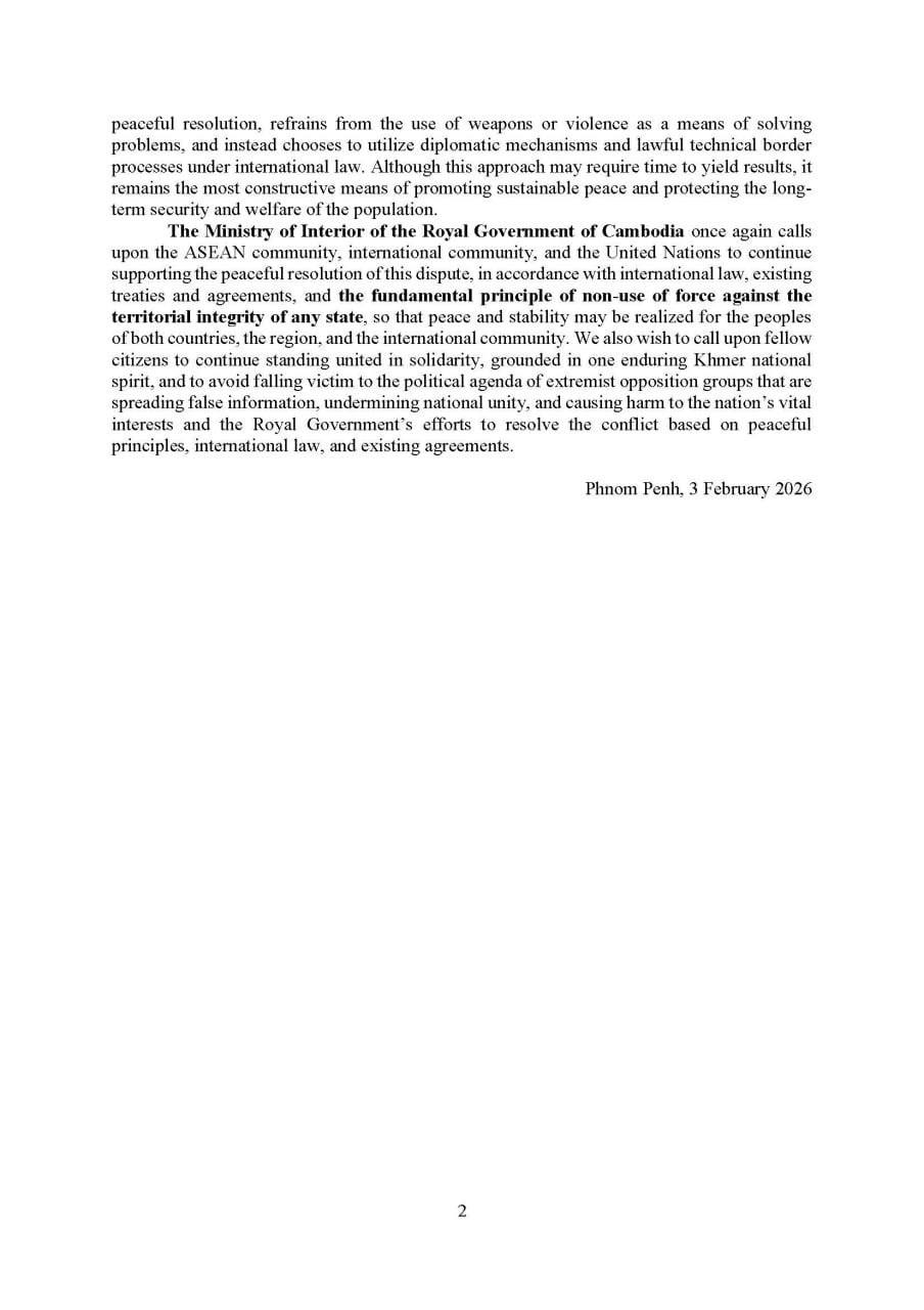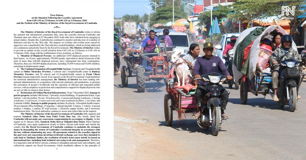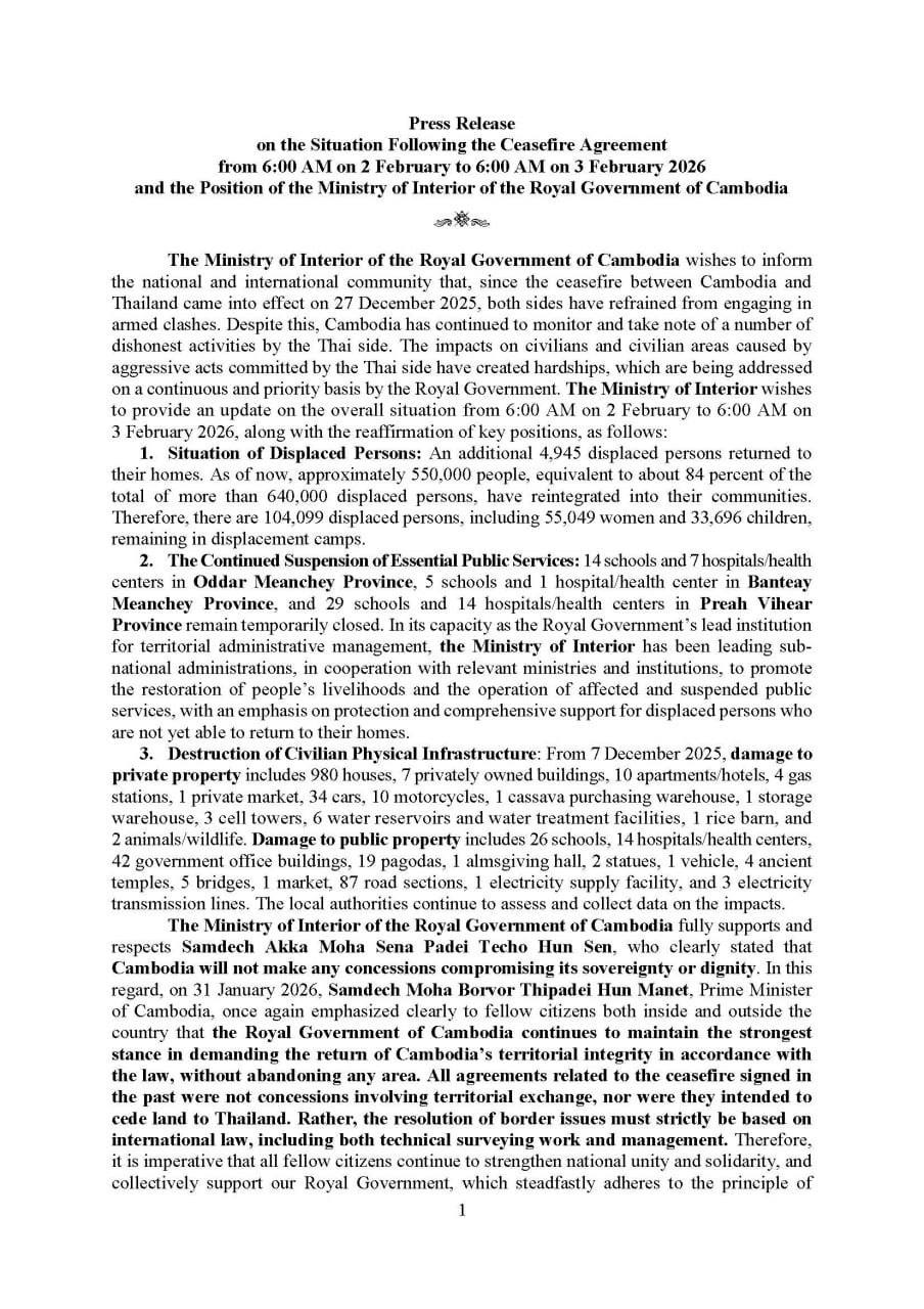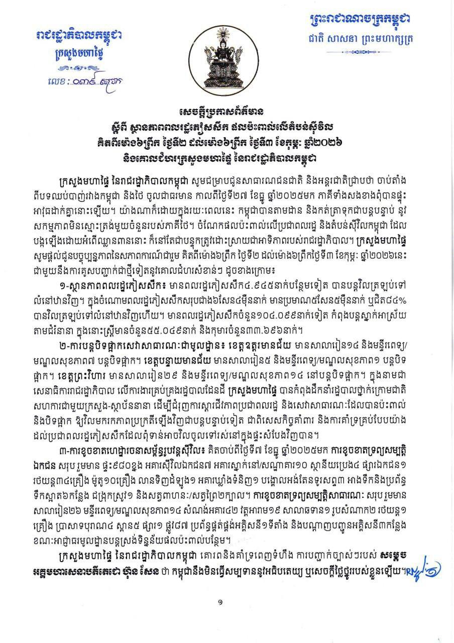 (Phnom Penh): The Cambodian Ministry of Interior issued an update on Tuesday (Feb. 3) concerning the situation following the ceasefire agreement.