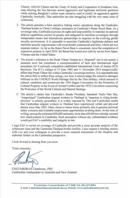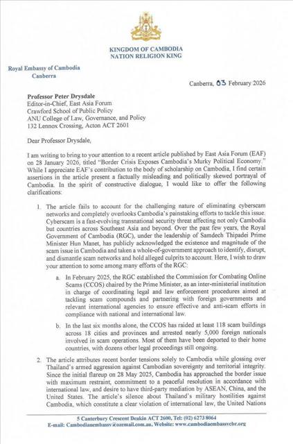 (Canberra): Below is the letter from Cheunboran Chanborey, Cambodian Ambassador to Australia and New Zealand, to the Editor-in-Chief of East Asia Forum (EAF), rebutting the article published by EAF on 28 January 2026, titled “Border Crisis Exposes Cambodia’s Murky Political Economy”.