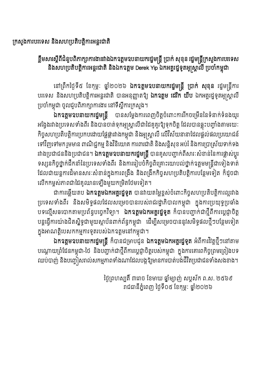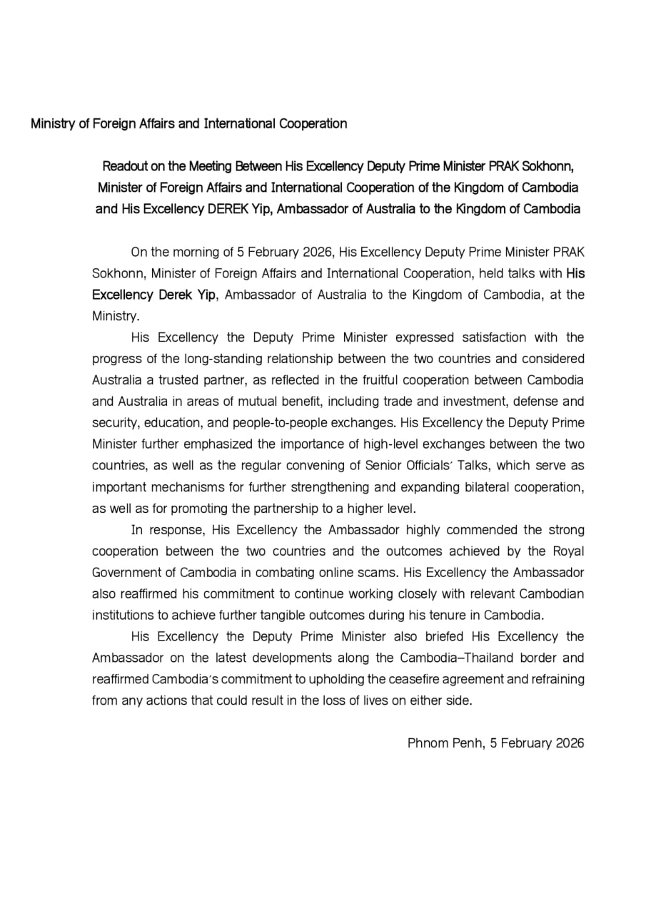 (Phnom Penh): On the morning of 5 February 2026, Cambodian Foreign Minister Prak Sokhonn held talks with Derek Yip, Ambassador of Australia to the Kingdom of Cambodia, at the Ministry of Foreign Affairs and International Cooperation, according to a press release seen by Fresh News on Friday (Feb. 6)