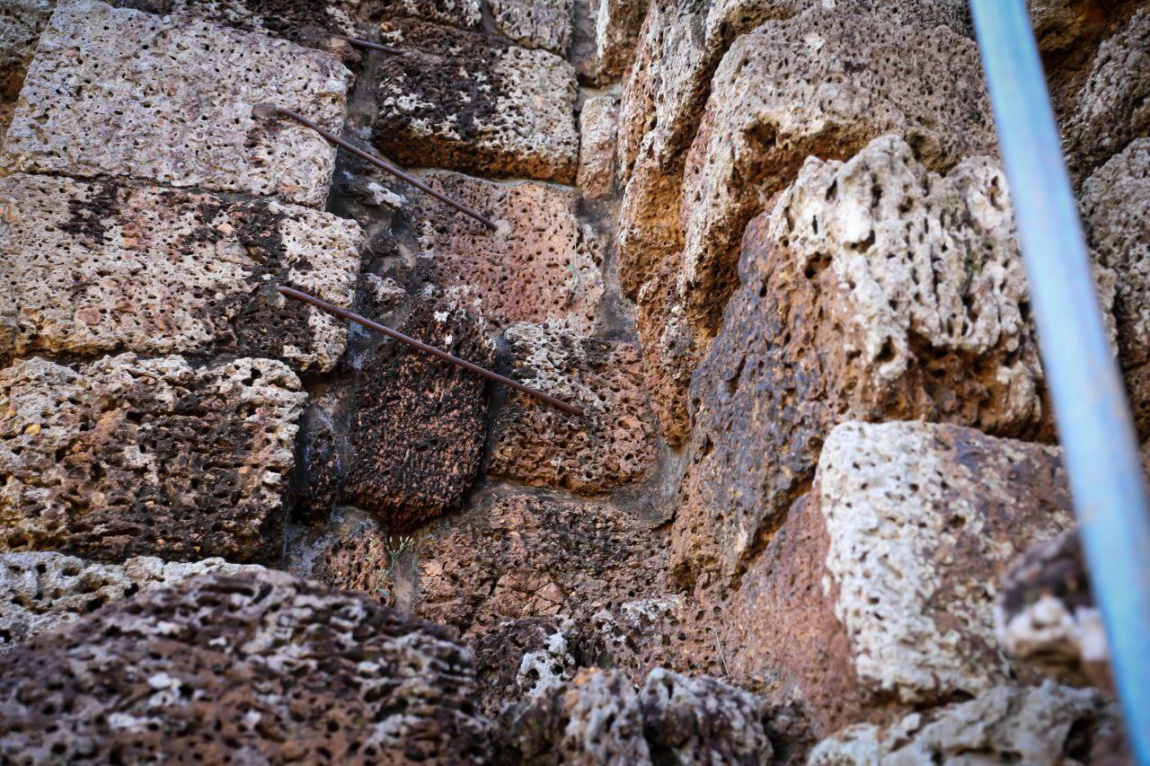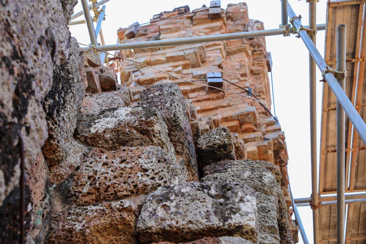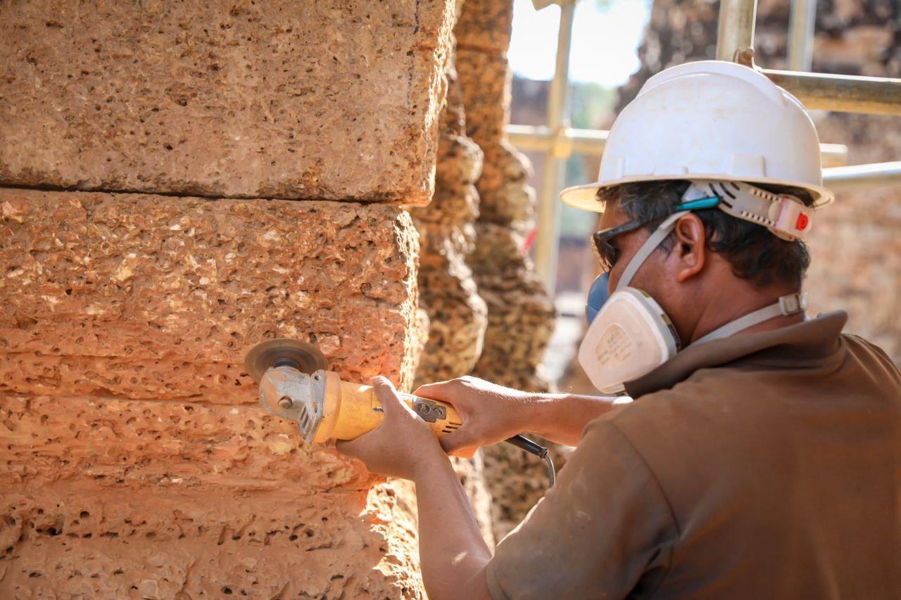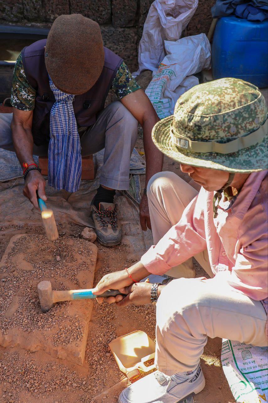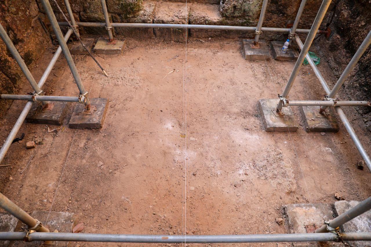 The lower structure and foundation of the gate are made of laterite, while the upper section is built of brick. The restoration team is focusing on strengthening the laterite base by cleaning soil from stone joints and cracks and resealing them with mortar to prevent water infiltration. Stones in good condition are preserved, while severely damaged stones are replaced with new ones that match the original form and technique. More than 50% of the restoration work has already been completed.
