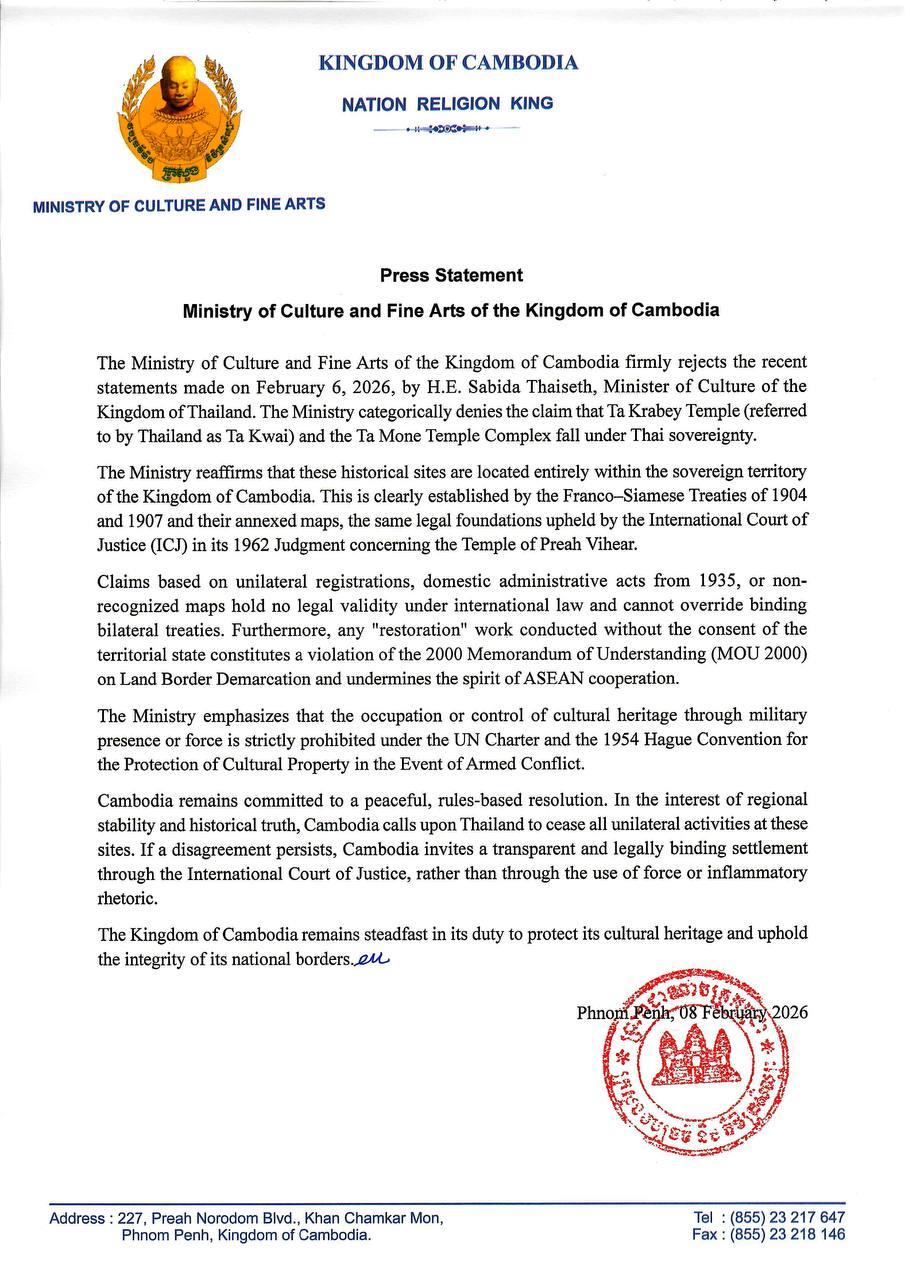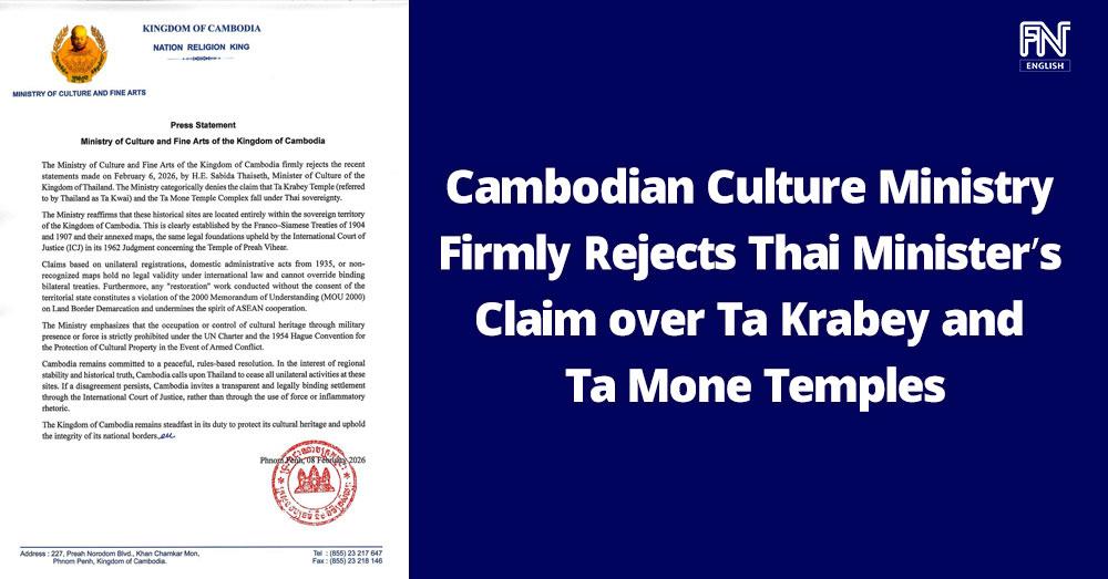 (Phnom Penh): The Ministry of Culture and Fine Arts of the Kingdom of Cambodia firmly rejected the recent statements made on 6 February 2026 by Sabida Thaiseth, Minister of Culture of the Kingdom of Thailand. The ministry categorically denied the claim that Ta Krabey Temple (referred to by Thailand as Ta Kwai) and the Ta Mone Temple Complex fall under Thai sovereignty, according to a press statement seen by Fresh News on Sunday (Feb. 8).